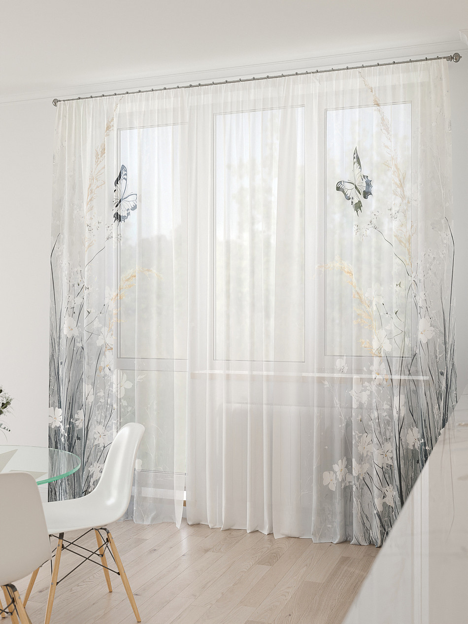 Тюль 3 шт. Легкая основа (вуаль) оформлена фотопечатью. Шторы состоят из 3-х полотен, не сшитых между собой, что обеспечивает легкий доступ к балконной двери. Вуаль с матовой полупрозрачной текстурой. Отличается особым шиком, идеально подходит для создания воздушных штор. Придает ощущение свежести, хорошо пропускает воздух. Ткань неприхотлива в уходе, хорошо стирается без разрушения волокон с течением времени за счет высокого кручения нитей.