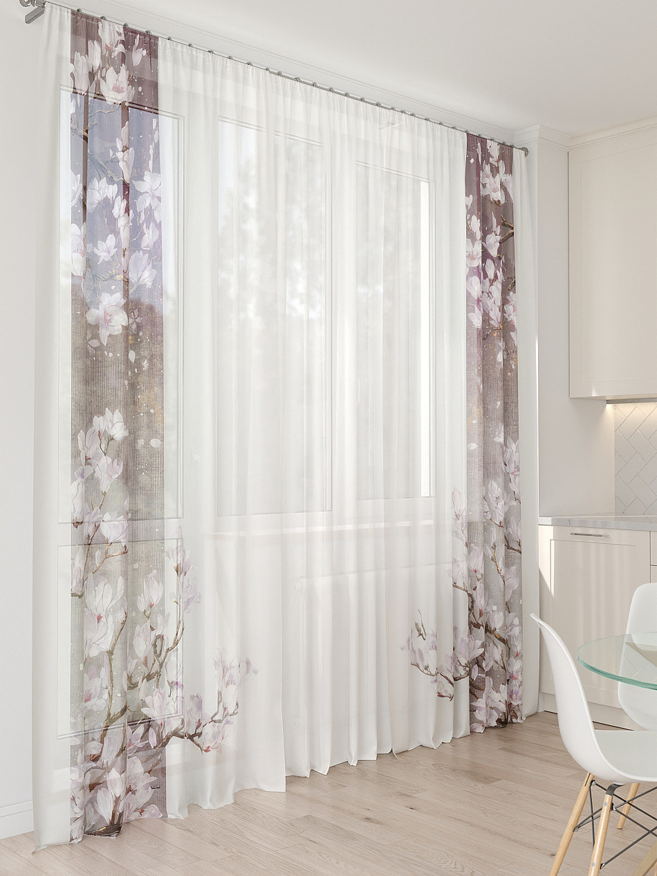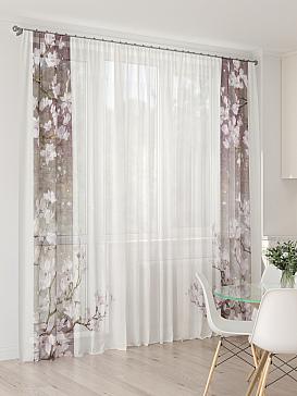 Тюль 3 шт. Легкая основа (вуаль) оформлена фотопечатью. Шторы состоят из 3-х полотен, не сшитых между собой, что обеспечивает легкий доступ к балконной двери. Вуаль с матовой полупрозрачной текстурой. Отличается особым шиком, идеально подходит для создания воздушных штор. Придает ощущение свежести, хорошо пропускает воздух. Ткань неприхотлива в уходе, хорошо стирается без разрушения волокон с течением времени за счет высокого кручения нитей.