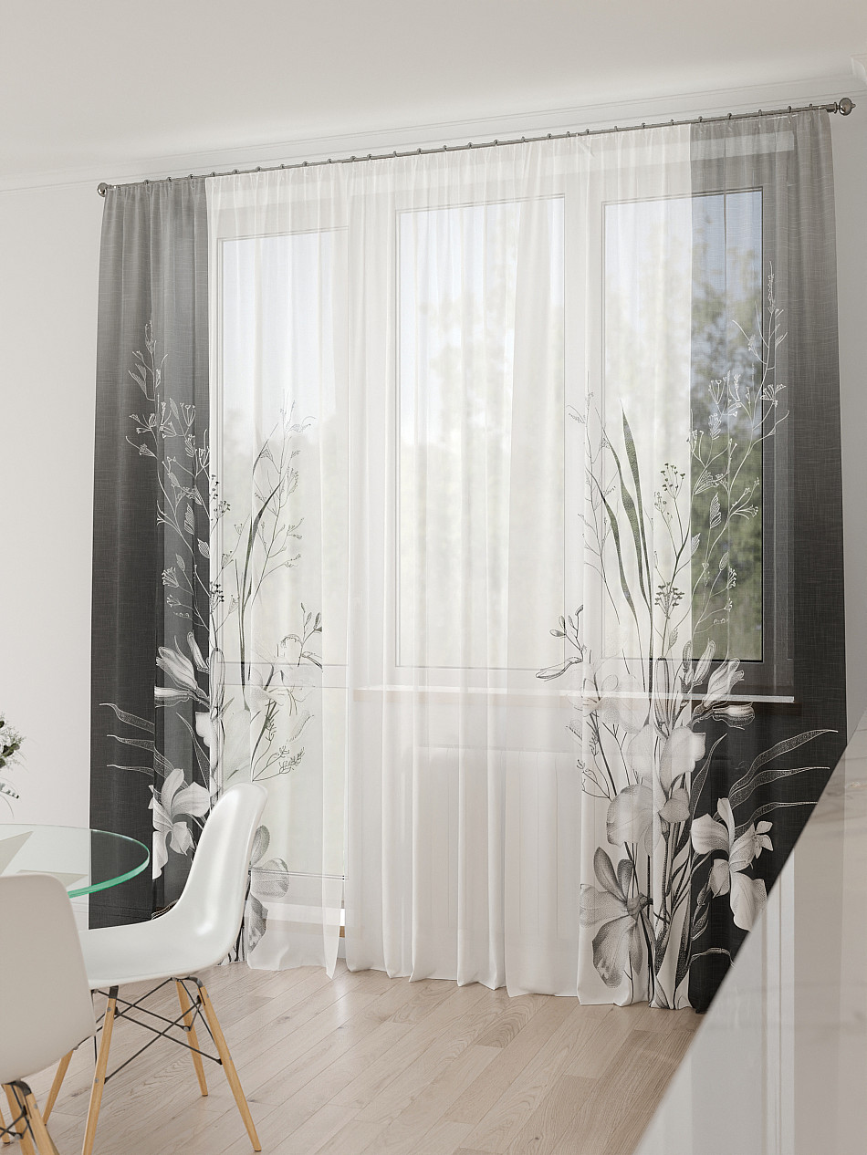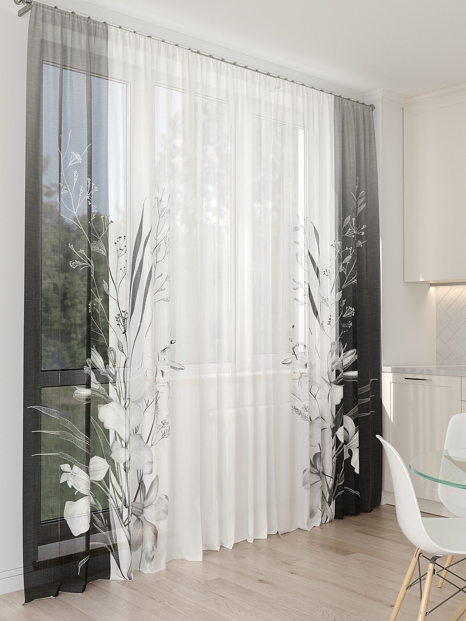 Тюль 3 шт. Легкая основа (вуаль) оформлена фотопечатью. Шторы состоят из 3-х полотен, не сшитых между собой, что обеспечивает легкий доступ к балконной двери. Вуаль с матовой полупрозрачной текстурой. Отличается особым шиком, идеально подходит для создания воздушных штор. Придает ощущение свежести, хорошо пропускает воздух. Ткань неприхотлива в уходе, хорошо стирается без разрушения волокон с течением времени за счет высокого кручения нитей.