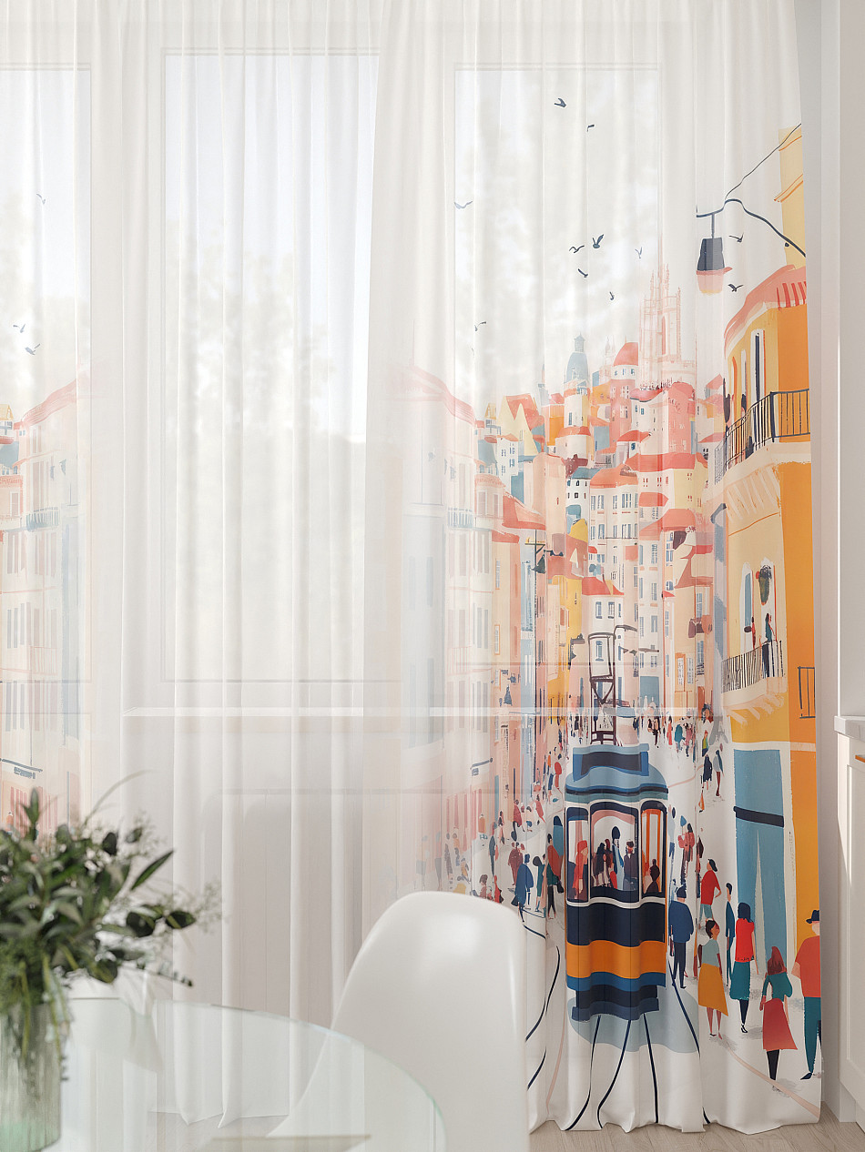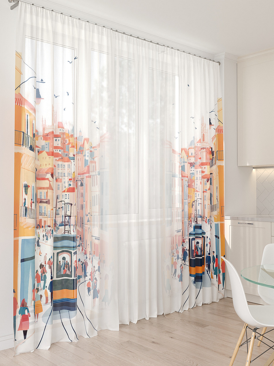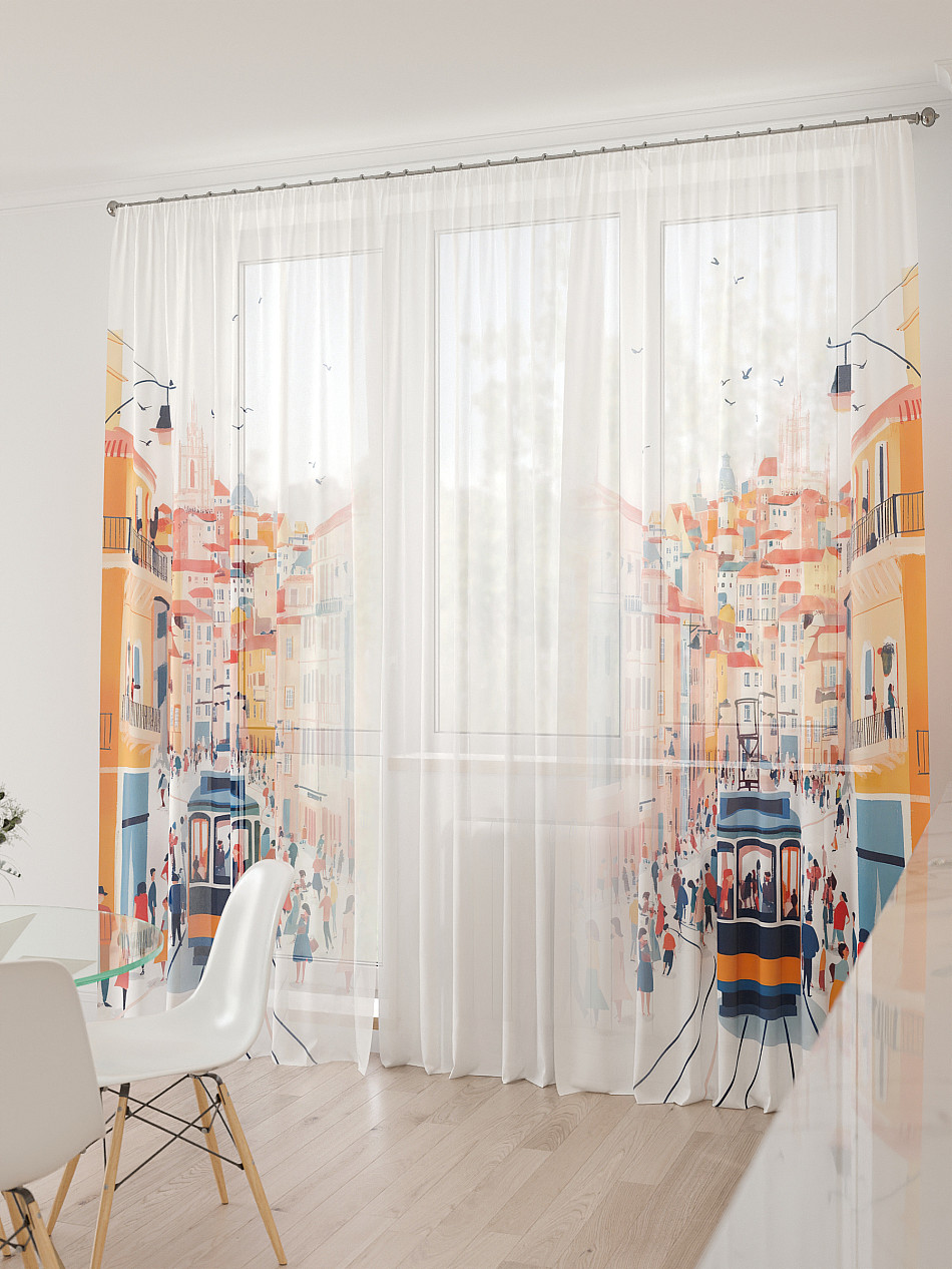 Тюль 3 шт. Легкая основа (вуаль) оформлена фотопечатью. Шторы состоят из 3-х полотен, не сшитых между собой, что обеспечивает легкий доступ к балконной двери. Вуаль с матовой полупрозрачной текстурой. Отличается особым шиком, идеально подходит для создания воздушных штор. Придает ощущение свежести, хорошо пропускает воздух. Ткань неприхотлива в уходе, хорошо стирается без разрушения волокон с течением времени за счет высокого кручения нитей.