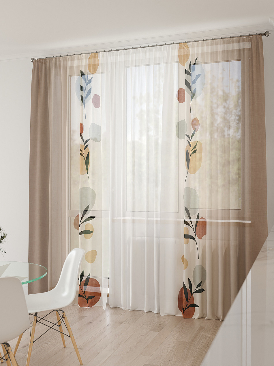 Тюль 3 шт. Легкая основа (вуаль) оформлена фотопечатью. Шторы состоят из 3-х полотен, не сшитых между собой, что обеспечивает легкий доступ к балконной двери. Вуаль с матовой полупрозрачной текстурой. Отличается особым шиком, идеально подходит для создания воздушных штор. Придает ощущение свежести, хорошо пропускает воздух. Ткань неприхотлива в уходе, хорошо стирается без разрушения волокон с течением времени за счет высокого кручения нитей.