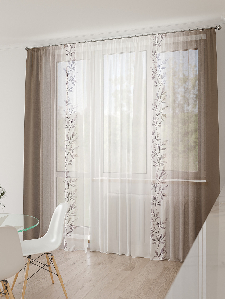 Тюль 3 шт. Легкая основа (вуаль) оформлена фотопечатью. Шторы состоят из 3-х полотен, не сшитых между собой, что обеспечивает легкий доступ к балконной двери. Вуаль с матовой полупрозрачной текстурой. Отличается особым шиком, идеально подходит для создания воздушных штор. Придает ощущение свежести, хорошо пропускает воздух. Ткань неприхотлива в уходе, хорошо стирается без разрушения волокон с течением времени за счет высокого кручения нитей.