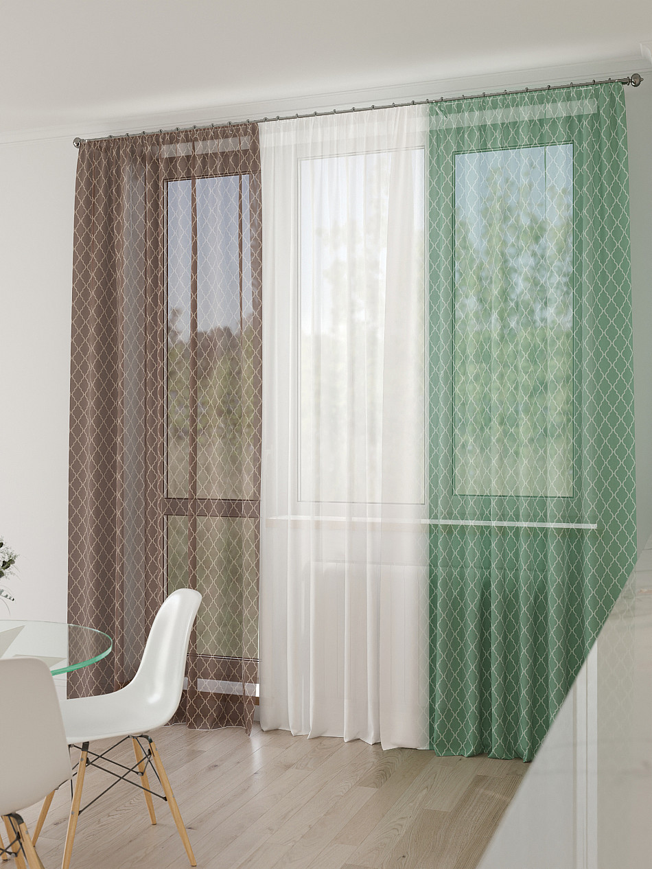Тюль 3 шт. Легкая основа (вуаль) оформлена фотопечатью. Шторы состоят из 3-х полотен, не сшитых между собой, что обеспечивает легкий доступ к балконной двери. Вуаль с матовой полупрозрачной текстурой. Отличается особым шиком, идеально подходит для создания воздушных штор. Придает ощущение свежести, хорошо пропускает воздух. Ткань неприхотлива в уходе, хорошо стирается без разрушения волокон с течением времени за счет высокого кручения нитей.