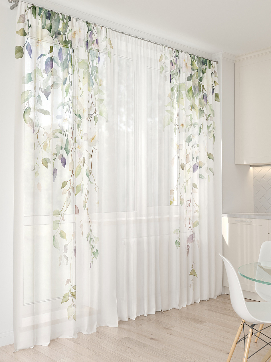Тюль 3 шт. Легкая основа (вуаль) оформлена фотопечатью. Шторы состоят из 3-х полотен, не сшитых между собой, что обеспечивает легкий доступ к балконной двери. Вуаль с матовой полупрозрачной текстурой. Отличается особым шиком, идеально подходит для создания воздушных штор. Придает ощущение свежести, хорошо пропускает воздух. Ткань неприхотлива в уходе, хорошо стирается без разрушения волокон с течением времени за счет высокого кручения нитей.