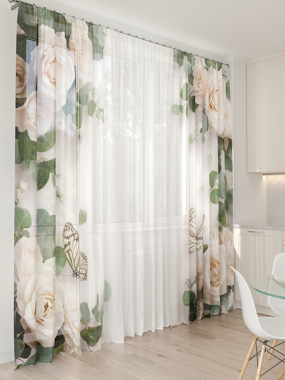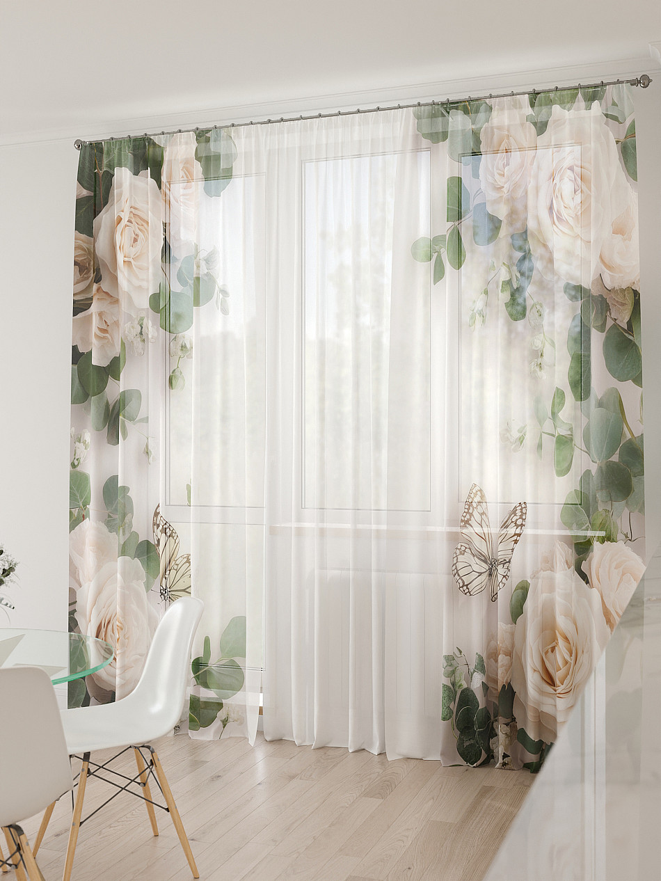 Тюль 3 шт. Легкая основа (вуаль) оформлена фотопечатью. Шторы состоят из 3-х полотен, не сшитых между собой, что обеспечивает легкий доступ к балконной двери. Вуаль с матовой полупрозрачной текстурой. Отличается особым шиком, идеально подходит для создания воздушных штор. Придает ощущение свежести, хорошо пропускает воздух. Ткань неприхотлива в уходе, хорошо стирается без разрушения волокон с течением времени за счет высокого кручения нитей.