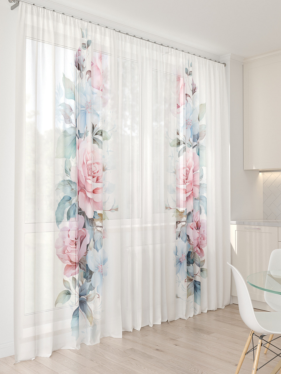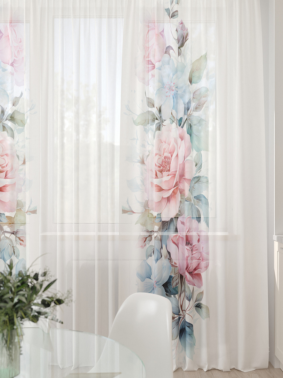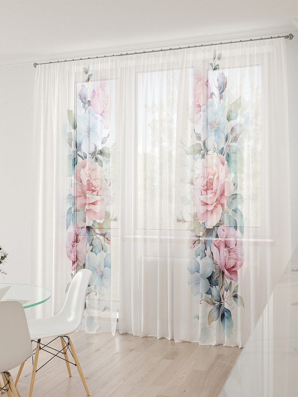 Тюль 3 шт. Легкая основа (вуаль) оформлена фотопечатью. Шторы состоят из 3-х полотен, не сшитых между собой, что обеспечивает легкий доступ к балконной двери. Вуаль с матовой полупрозрачной текстурой. Отличается особым шиком, идеально подходит для создания воздушных штор. Придает ощущение свежести, хорошо пропускает воздух. Ткань неприхотлива в уходе, хорошо стирается без разрушения волокон с течением времени за счет высокого кручения нитей.