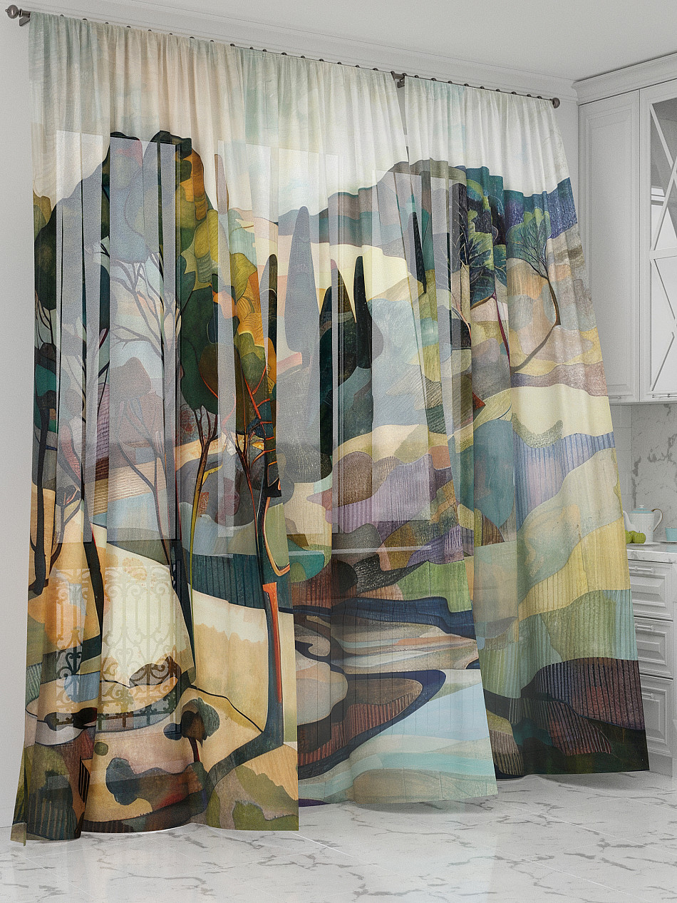 Тюль 3 шт. Легкая основа (вуаль) оформлена фотопечатью. Шторы состоят из 3-х полотен, не сшитых между собой, что обеспечивает легкий доступ к балконной двери. Вуаль с матовой полупрозрачной текстурой. Отличается особым шиком, идеально подходит для создания воздушных штор. Придает ощущение свежести, хорошо пропускает воздух. Ткань неприхотлива в уходе, хорошо стирается без разрушения волокон с течением времени за счет высокого кручения нитей.