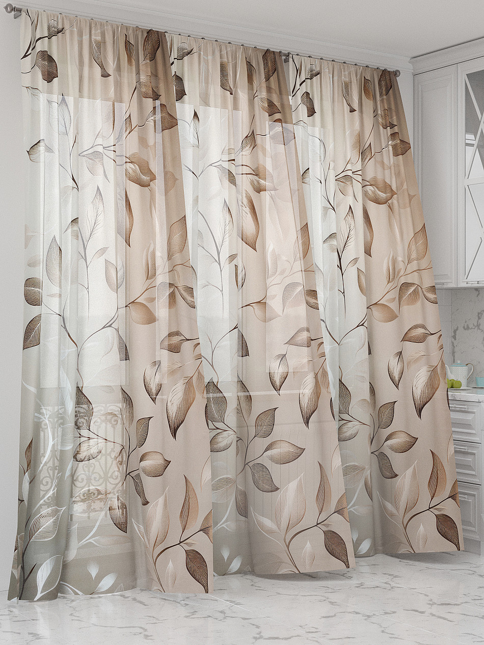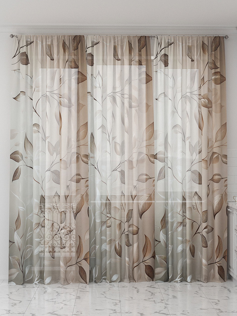Тюль 3 шт. Легкая основа (вуаль) оформлена фотопечатью. Шторы состоят из 3-х полотен, не сшитых между собой, что обеспечивает легкий доступ к балконной двери. Вуаль с матовой полупрозрачной текстурой. Отличается особым шиком, идеально подходит для создания воздушных штор. Придает ощущение свежести, хорошо пропускает воздух. Ткань неприхотлива в уходе, хорошо стирается без разрушения волокон с течением времени за счет высокого кручения нитей.