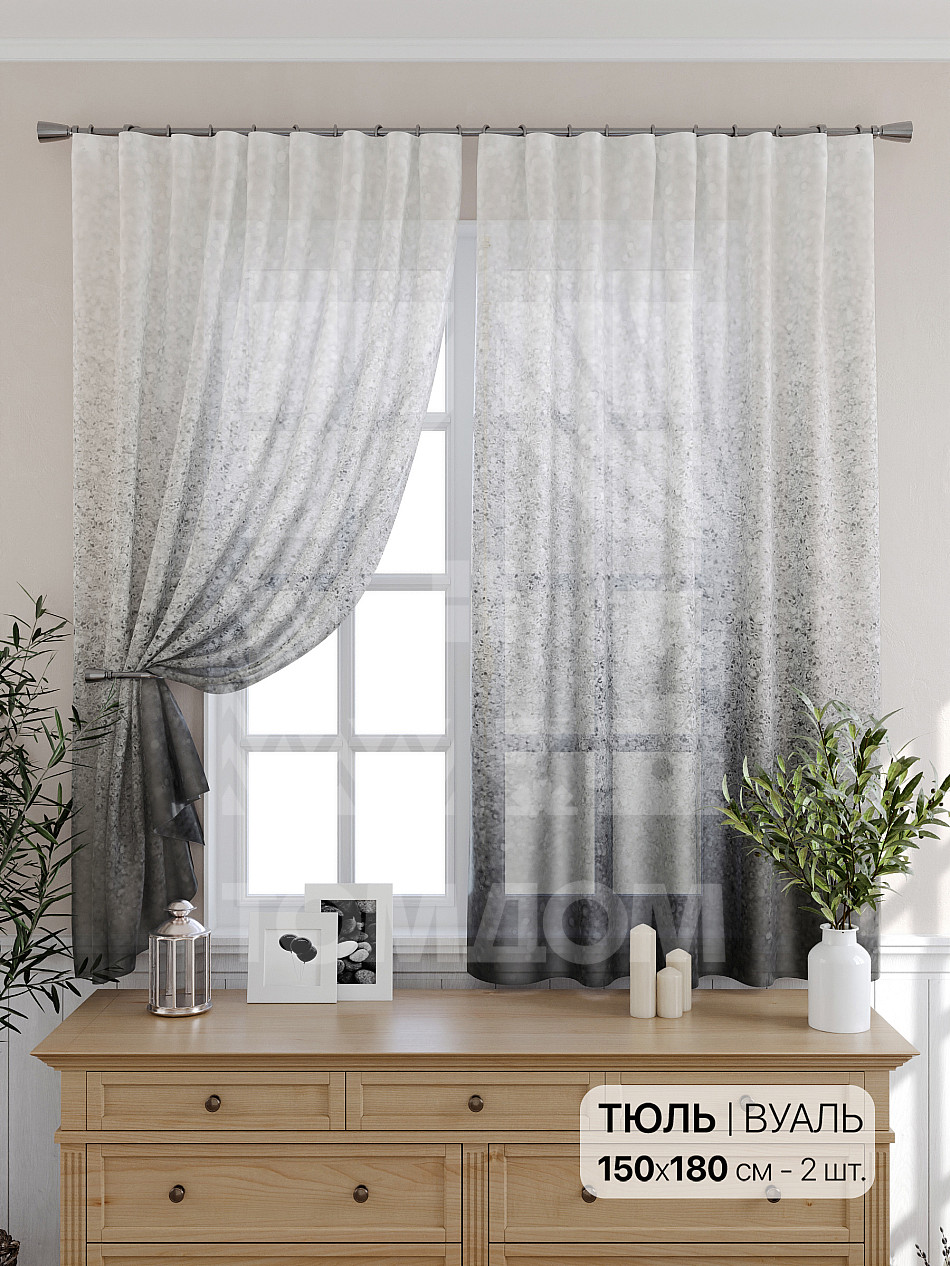 Тюль 2 шт. Подхват - доп.услуга. Легкая основа (вуаль) оформлена принтом. Вуаль с матовой полупрозрачной текстурой. Отличается особым шиком, идеально подходит для создания воздушных штор. Придает ощущение свежести, хорошо пропускает воздух. Ткань неприхотлива в уходе, хорошо стирается без разрушения волокон с течением времени за счет высокого кручения нитей.