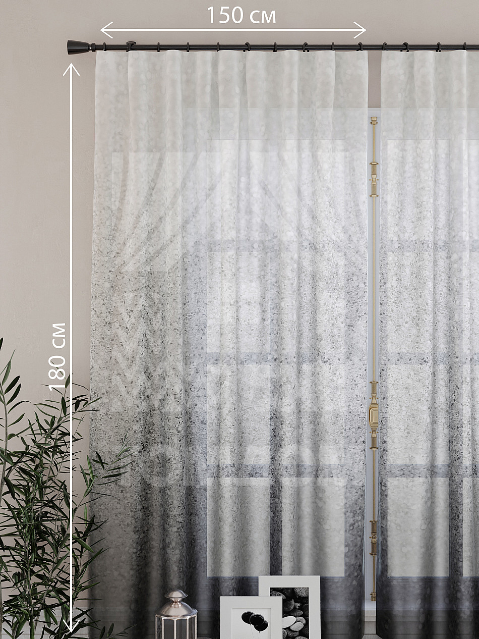 Ширина одного тюля без сборки 150 см, высота 180 см.