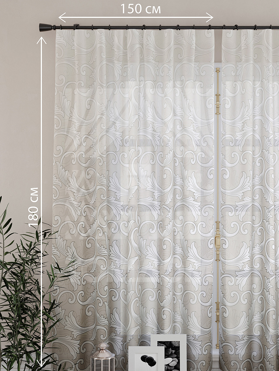 Ширина одного тюля без сборки 150 см, высота 180 см.