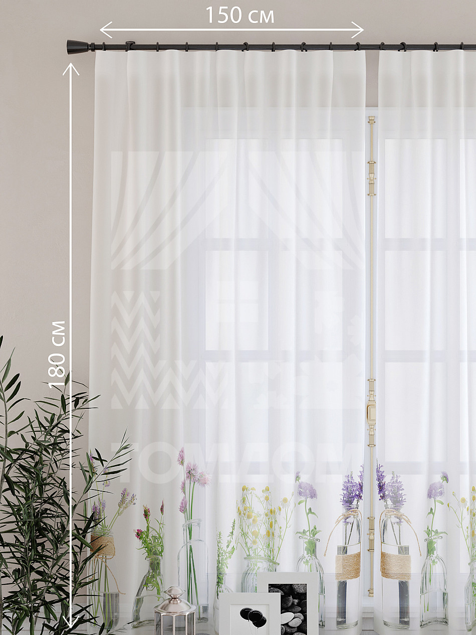 Ширина одного тюля без сборки 150 см, высота 180 см.