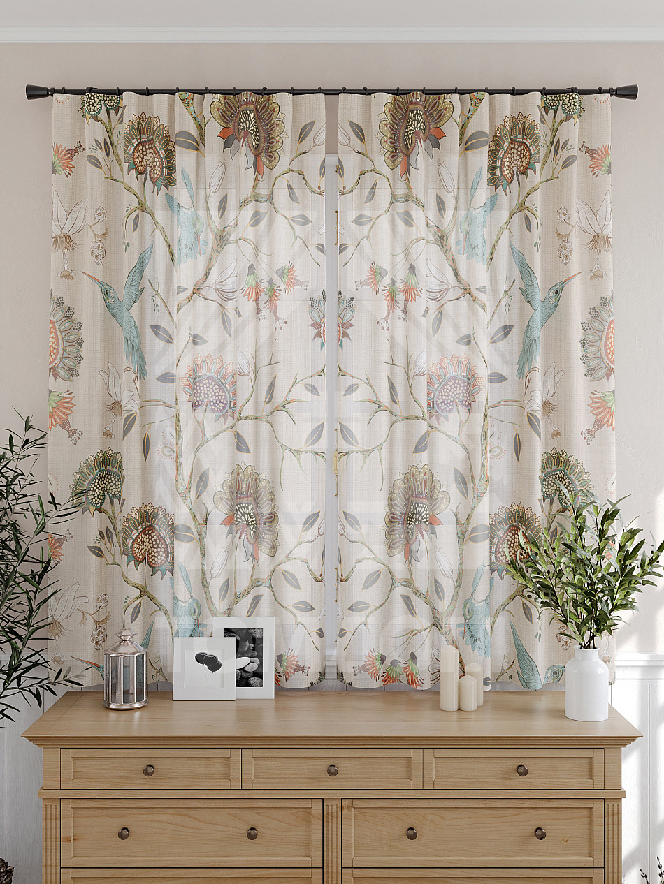 Тюль 2 шт. Подхват - доп.услуга. Легкая основа (вуаль) оформлена принтом. Вуаль с матовой полупрозрачной текстурой. Отличается особым шиком, идеально подходит для создания воздушных штор. Придает ощущение свежести, хорошо пропускает воздух. Ткань неприхотлива в уходе, хорошо стирается без разрушения волокон с течением времени за счет высокого кручения нитей.