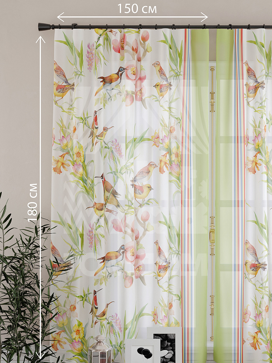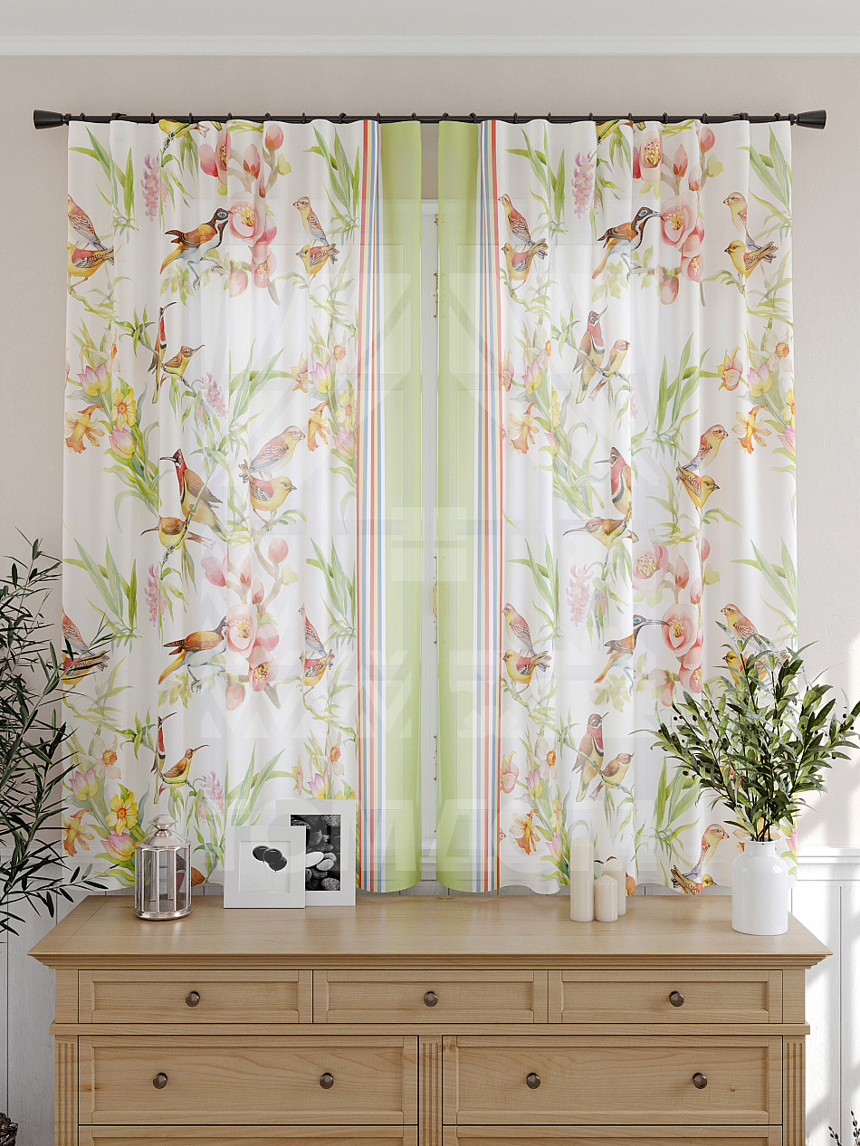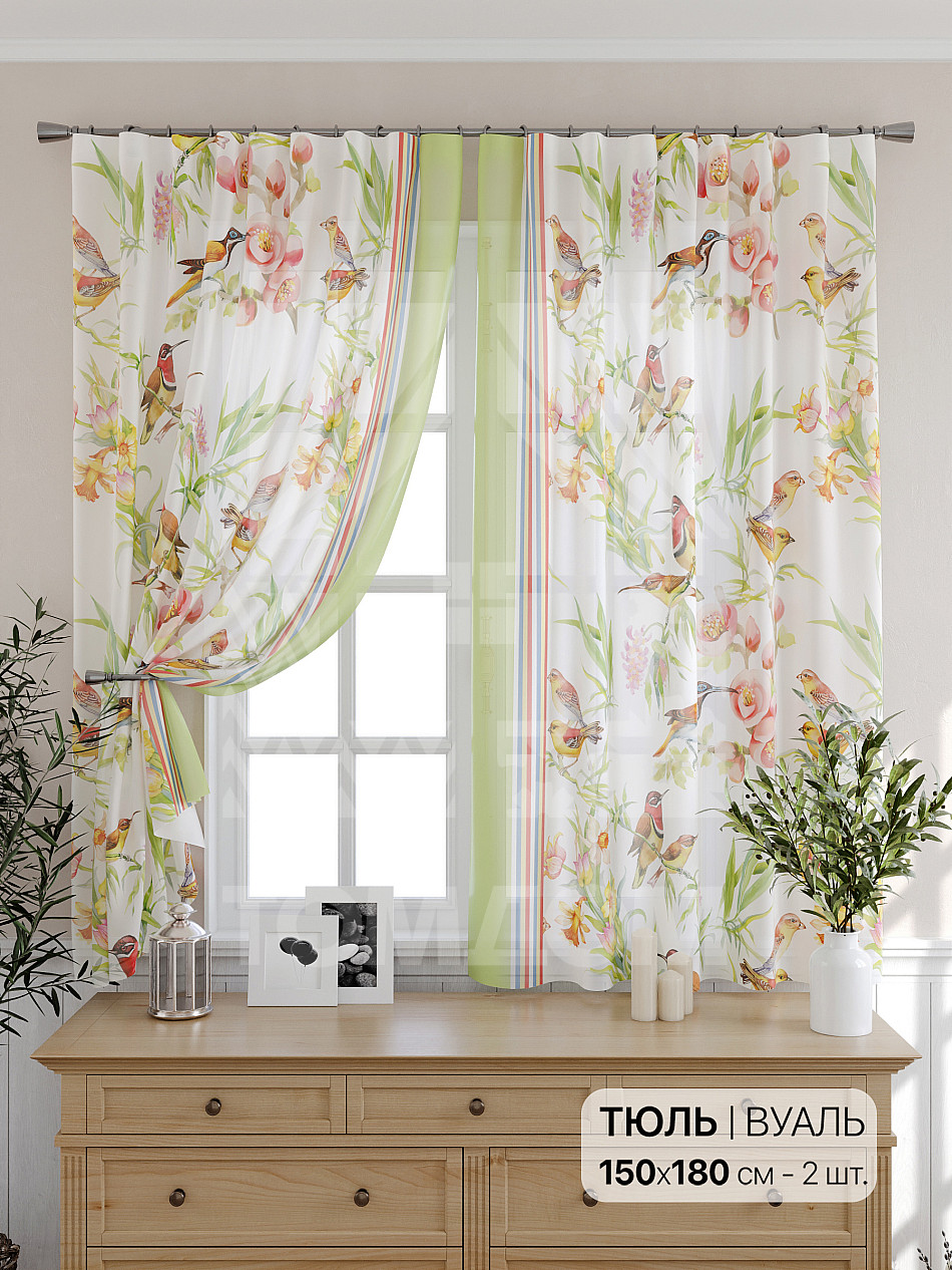 Тюль 2 шт. Подхват - доп.услуга. Легкая основа (вуаль) оформлена принтом. Вуаль с матовой полупрозрачной текстурой. Отличается особым шиком, идеально подходит для создания воздушных штор. Придает ощущение свежести, хорошо пропускает воздух. Ткань неприхотлива в уходе, хорошо стирается без разрушения волокон с течением времени за счет высокого кручения нитей.