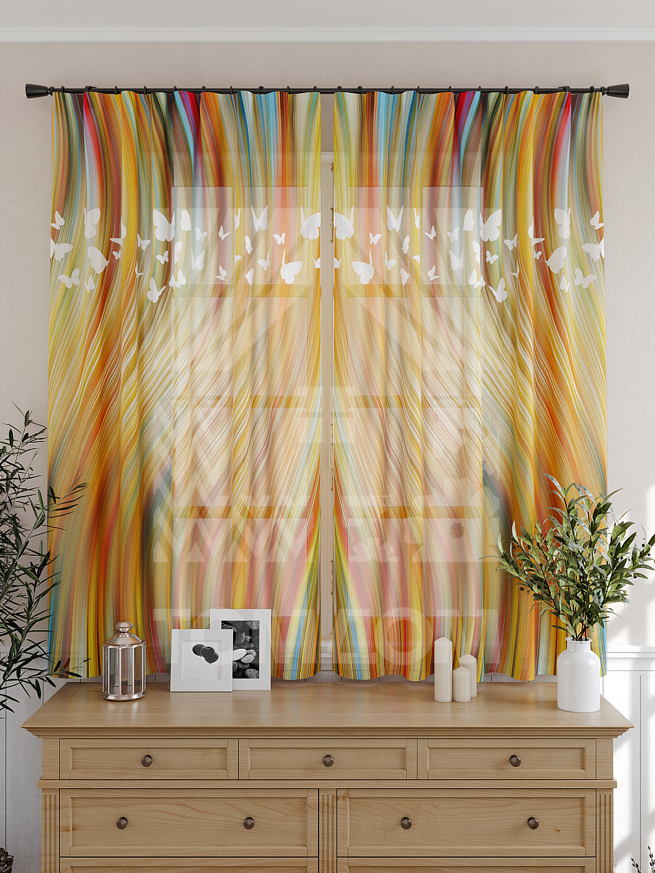 Тюль 2 шт. Подхват - доп.услуга. Легкая основа (вуаль) оформлена принтом. Вуаль с матовой полупрозрачной текстурой. Отличается особым шиком, идеально подходит для создания воздушных штор. Придает ощущение свежести, хорошо пропускает воздух. Ткань неприхотлива в уходе, хорошо стирается без разрушения волокон с течением времени за счет высокого кручения нитей.