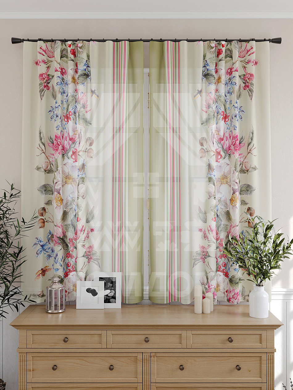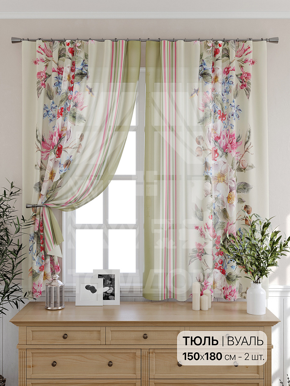 Тюль 2 шт. Подхват - доп.услуга. Легкая основа (вуаль) оформлена принтом. Вуаль с матовой полупрозрачной текстурой. Отличается особым шиком, идеально подходит для создания воздушных штор. Придает ощущение свежести, хорошо пропускает воздух. Ткань неприхотлива в уходе, хорошо стирается без разрушения волокон с течением времени за счет высокого кручения нитей.