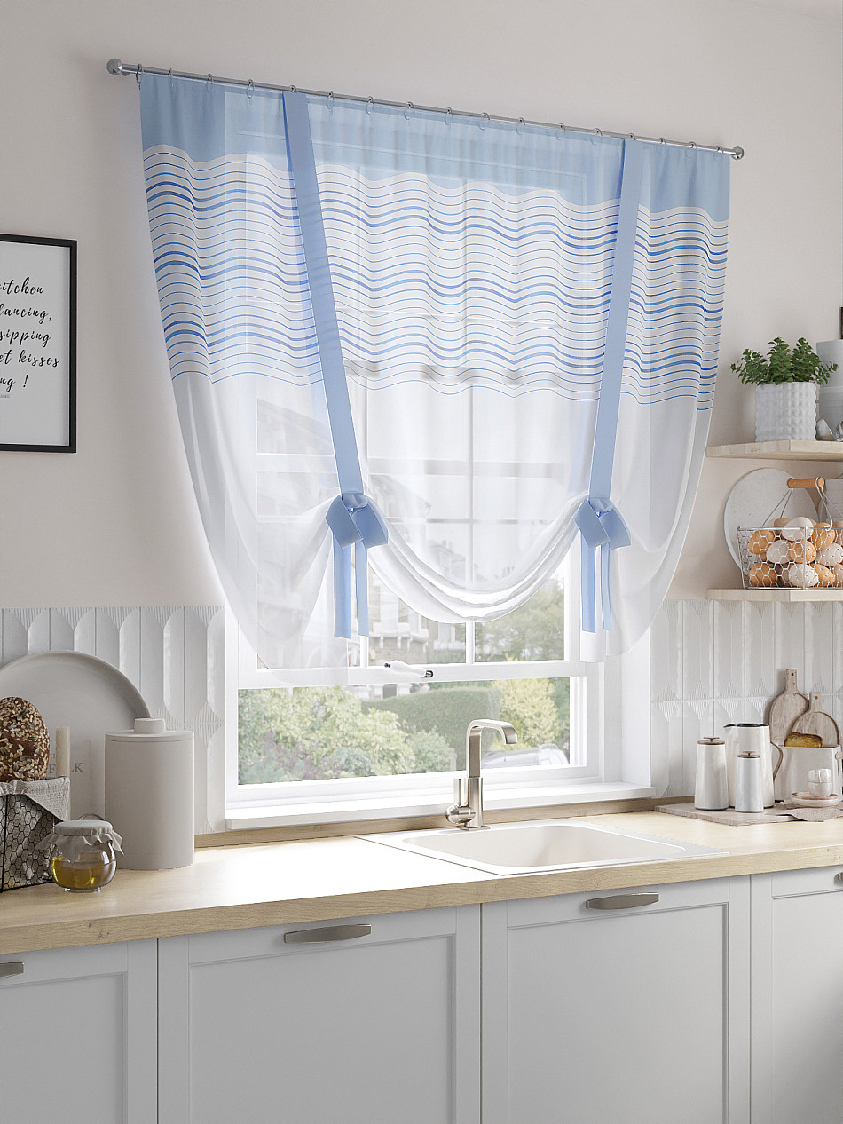 ВыбратьТюль 1 шт. Легкий, мягкий тюль из вуали оформлен фотопечатью, дополнен отделкой в виде декоративных завязок. Тюль имитирует римскую штору. Подъем и опускание осуществляется за счет декоративных лент. Вуаль с матовой полупрозрачной текстурой. Отличается особым шиком, идеально подходит для создания воздушных штор. Придает ощущение свежести, хорошо пропускает воздух. Ткань неприхотлива в уходе, хорошо стирается без разрушения волокон с течением времени за счет высокого кручения нитей.