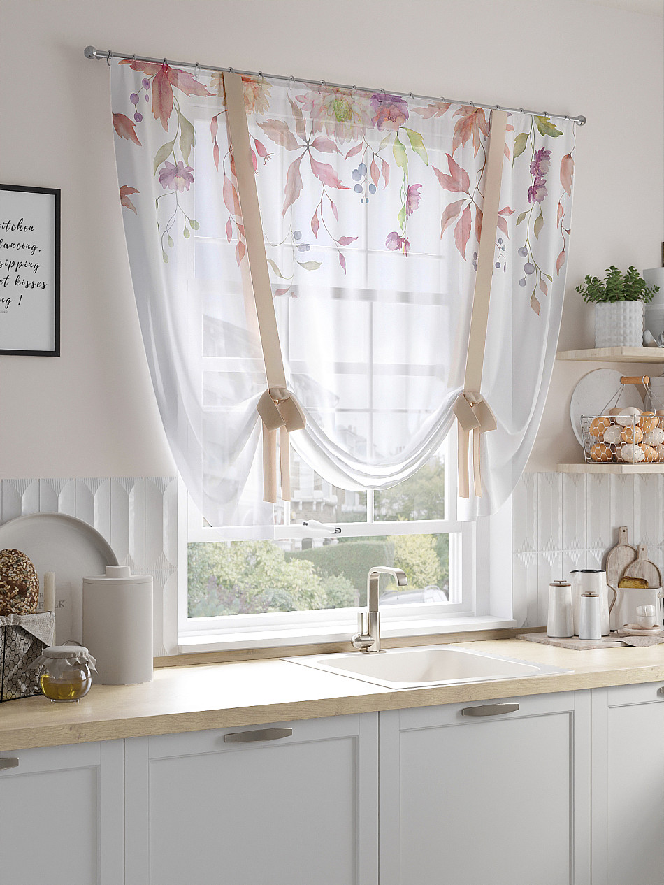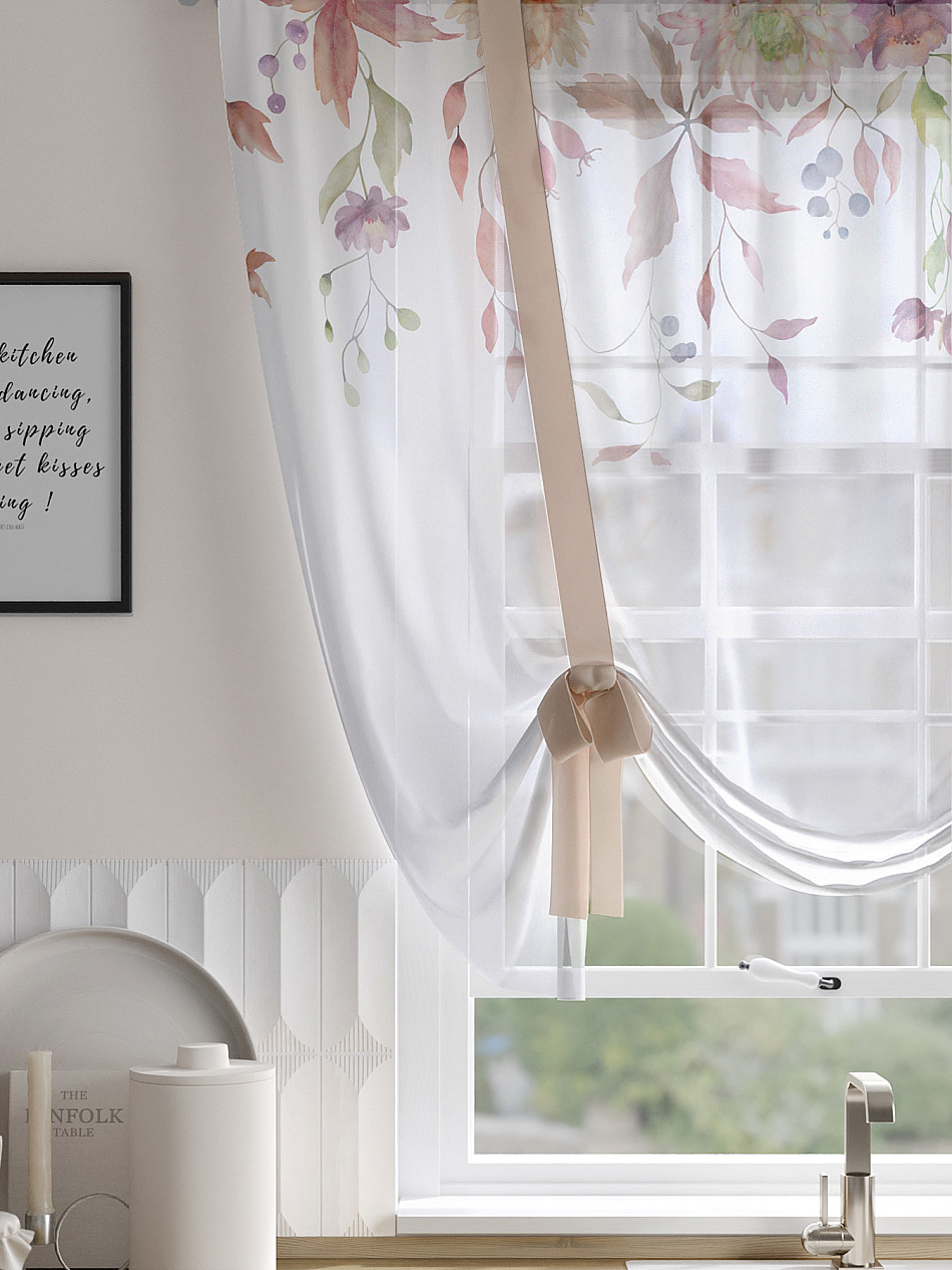 ВыбратьТюль 1 шт. Легкий, мягкий тюль из вуали оформлен фотопечатью, дополнен отделкой в виде декоративных завязок. Тюль имитирует римскую штору. Подъем и опускание осуществляется за счет декоративных лент. Вуаль с матовой полупрозрачной текстурой. Отличается особым шиком, идеально подходит для создания воздушных штор. Придает ощущение свежести, хорошо пропускает воздух. Ткань неприхотлива в уходе, хорошо стирается без разрушения волокон с течением времени за счет высокого кручения нитей.