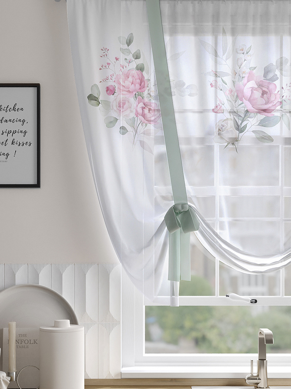 ВыбратьТюль 1 шт. Легкий, мягкий тюль из вуали оформлен фотопечатью, дополнен отделкой в виде декоративных завязок. Тюль имитирует римскую штору. Подъем и опускание осуществляется за счет декоративных лент. Вуаль с матовой полупрозрачной текстурой. Отличается особым шиком, идеально подходит для создания воздушных штор. Придает ощущение свежести, хорошо пропускает воздух. Ткань неприхотлива в уходе, хорошо стирается без разрушения волокон с течением времени за счет высокого кручения нитей.