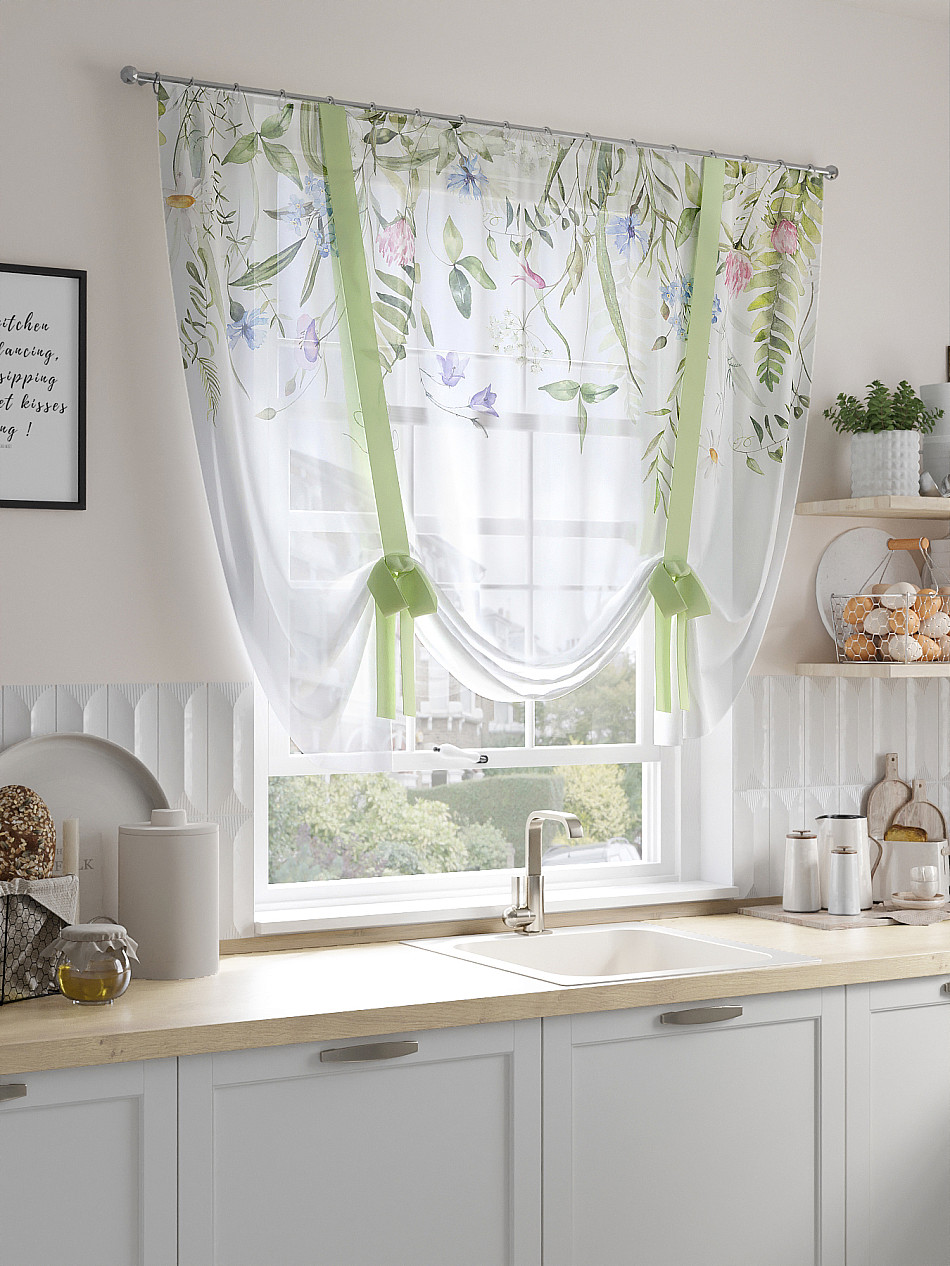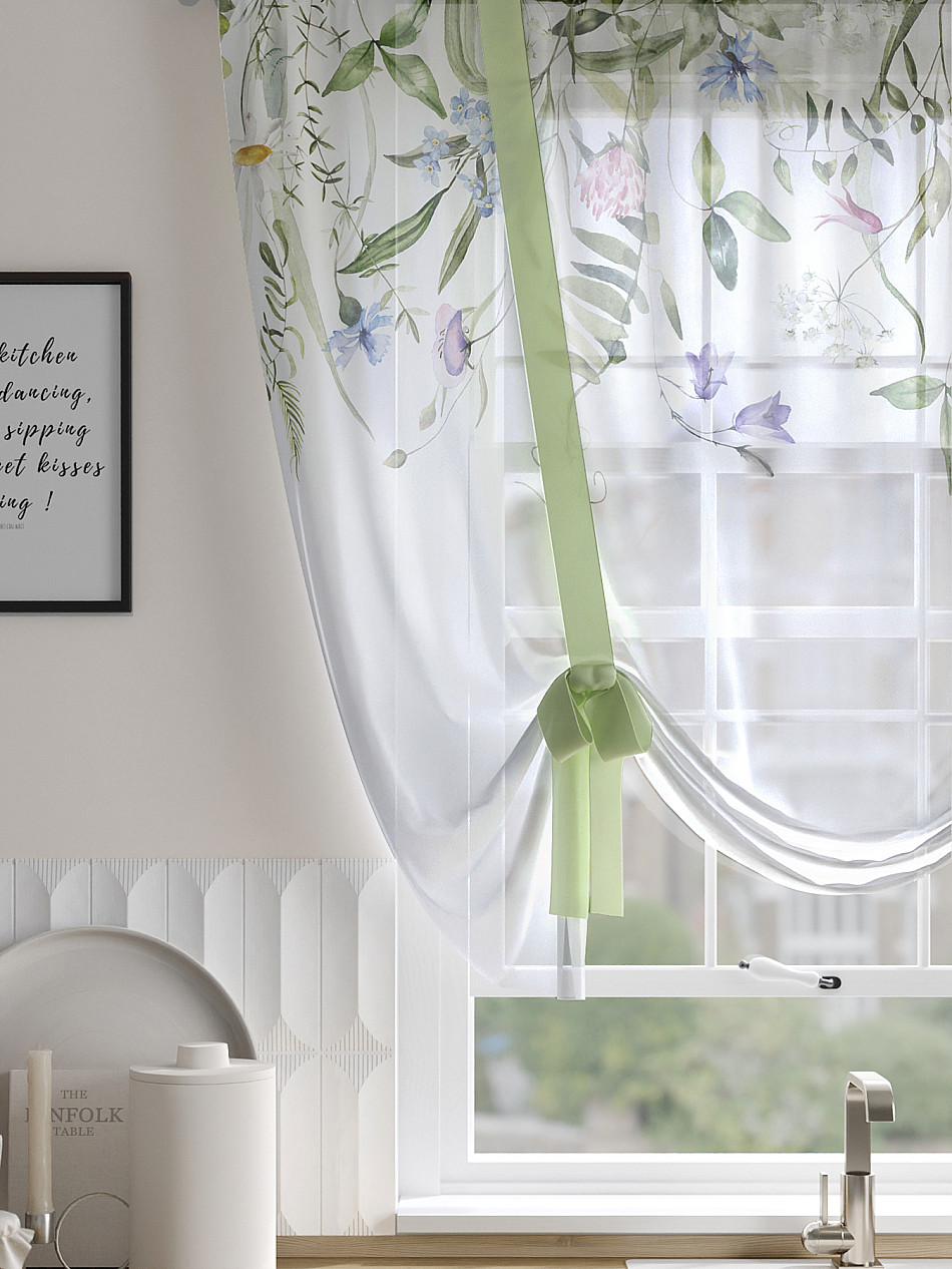 ВыбратьТюль 1 шт. Легкий, мягкий тюль из вуали оформлен фотопечатью, дополнен отделкой в виде декоративных завязок. Тюль имитирует римскую штору. Подъем и опускание осуществляется за счет декоративных лент. Вуаль с матовой полупрозрачной текстурой. Отличается особым шиком, идеально подходит для создания воздушных штор. Придает ощущение свежести, хорошо пропускает воздух. Ткань неприхотлива в уходе, хорошо стирается без разрушения волокон с течением времени за счет высокого кручения нитей.