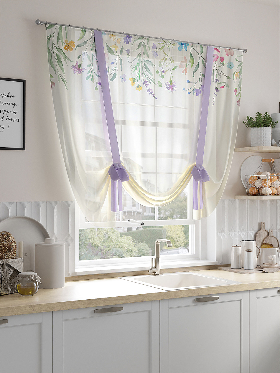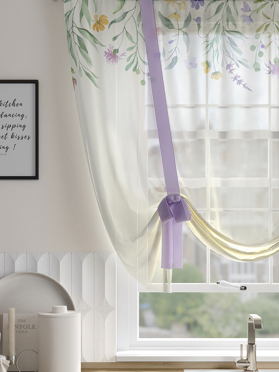 ВыбратьТюль 1 шт. Легкий, мягкий тюль из вуали оформлен фотопечатью, дополнен отделкой в виде декоративных завязок. Тюль имитирует римскую штору. Подъем и опускание осуществляется за счет декоративных лент. Вуаль с матовой полупрозрачной текстурой. Отличается особым шиком, идеально подходит для создания воздушных штор. Придает ощущение свежести, хорошо пропускает воздух. Ткань неприхотлива в уходе, хорошо стирается без разрушения волокон с течением времени за счет высокого кручения нитей.