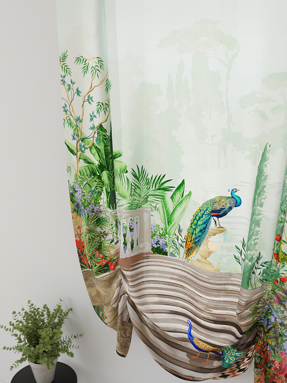 ВыбратьТюль 1 шт. Легкий, мягкий тюль из вуали оформлен фотопечатью, дополнен отделкой в виде декоративных завязок. Тюль имитирует австрийскую штору. Вуаль с матовой полупрозрачной текстурой. Отличается особым шиком, идеально подходит для создания воздушных штор. Придает ощущение свежести, хорошо пропускает воздух. Ткань неприхотлива в уходе, хорошо стирается без разрушения волокон с течением времени за счет высокого кручения нитей.
