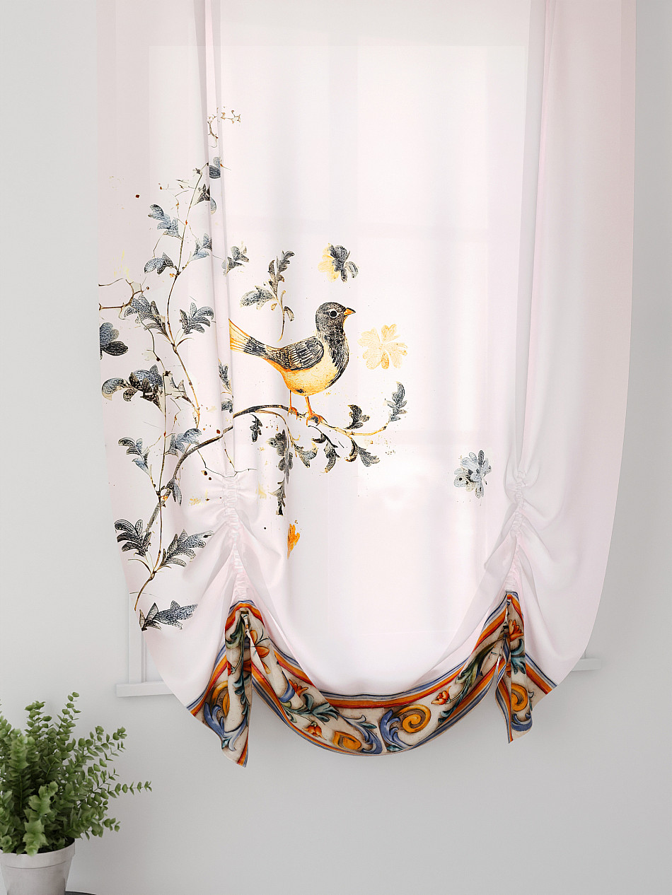 ВыбратьТюль 1 шт. Легкий, мягкий тюль из вуали оформлен фотопечатью, дополнен отделкой в виде декоративных завязок. Тюль имитирует австрийскую штору. Вуаль с матовой полупрозрачной текстурой. Отличается особым шиком, идеально подходит для создания воздушных штор. Придает ощущение свежести, хорошо пропускает воздух. Ткань неприхотлива в уходе, хорошо стирается без разрушения волокон с течением времени за счет высокого кручения нитей.