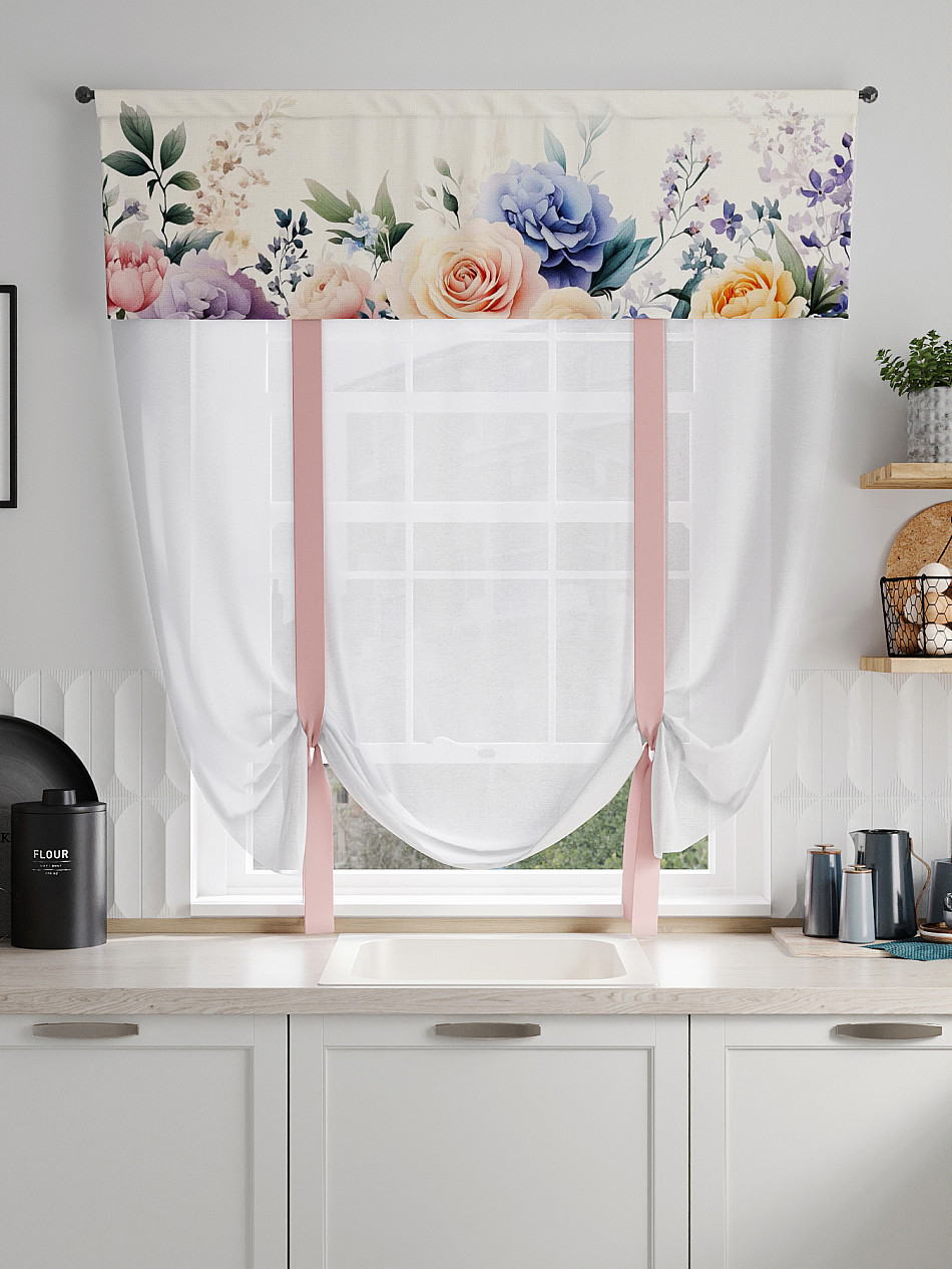 ВыбратьТюль 1 шт. Легкий, мягкий тюль из вуали дополнен отделкой в виде декоративных завязок и ламбрекеном, оформленным фотопечатью. Тюль имитирует римскую штору. Подъем и опускание осуществляется за счет декоративных лент. Вуаль с матовой полупрозрачной текстурой. Отличается особым шиком, идеально подходит для создания воздушных штор. Придает ощущение свежести, хорошо пропускает воздух. Ткань неприхотлива в уходе, хорошо стирается без разрушения волокон с течением времени за счет высокого кручения нитей.