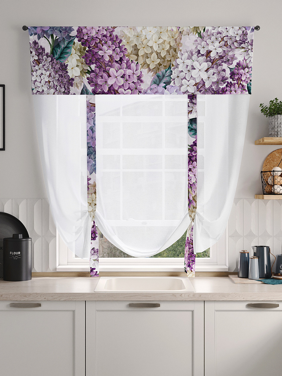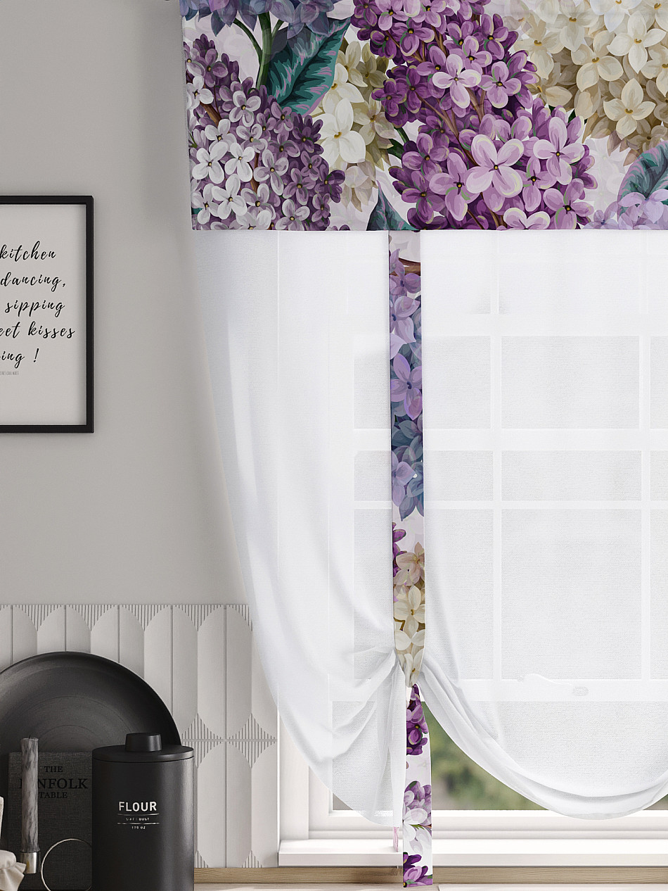 ВыбратьТюль 1 шт. Легкий, мягкий тюль из вуали дополнен отделкой в виде декоративных завязок и ламбрекеном, оформленным фотопечатью. Тюль имитирует римскую штору. Подъем и опускание осуществляется за счет декоративных лент. Вуаль с матовой полупрозрачной текстурой. Отличается особым шиком, идеально подходит для создания воздушных штор. Придает ощущение свежести, хорошо пропускает воздух. Ткань неприхотлива в уходе, хорошо стирается без разрушения волокон с течением времени за счет высокого кручения нитей.