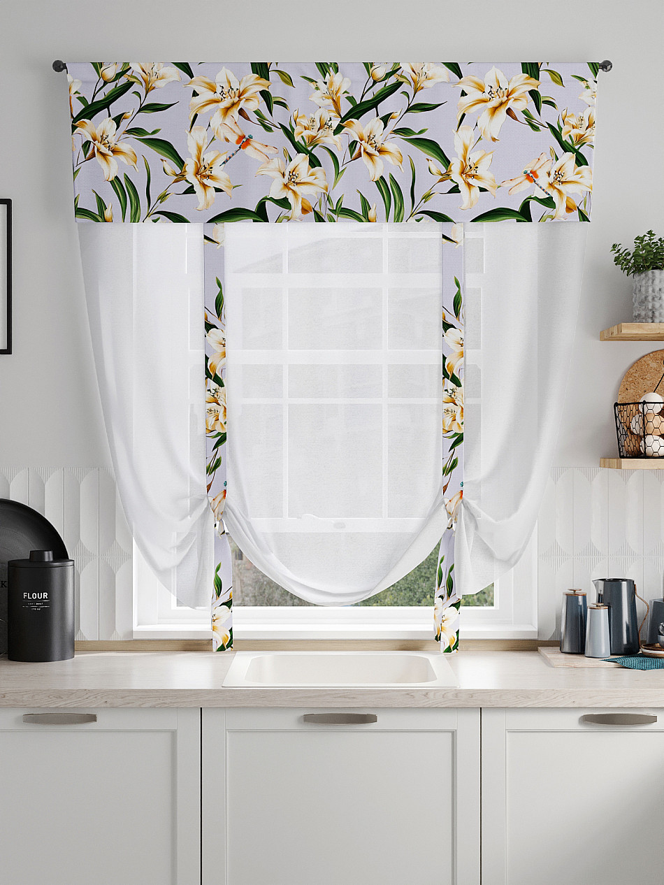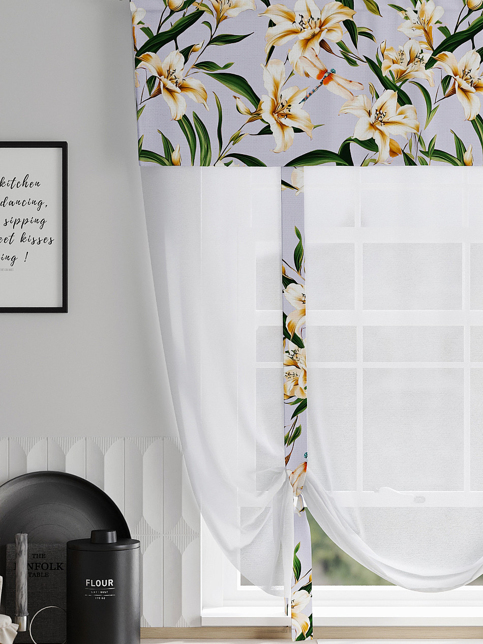 ВыбратьТюль 1 шт. Легкий, мягкий тюль из вуали дополнен отделкой в виде декоративных завязок и ламбрекеном, оформленным фотопечатью. Тюль имитирует римскую штору. Подъем и опускание осуществляется за счет декоративных лент. Вуаль с матовой полупрозрачной текстурой. Отличается особым шиком, идеально подходит для создания воздушных штор. Придает ощущение свежести, хорошо пропускает воздух. Ткань неприхотлива в уходе, хорошо стирается без разрушения волокон с течением времени за счет высокого кручения нитей.