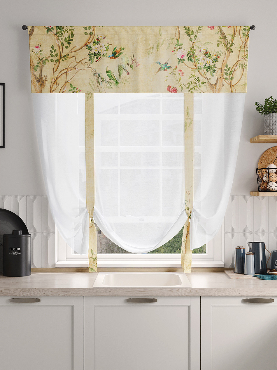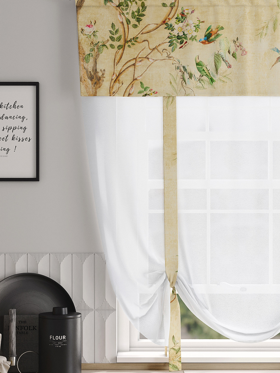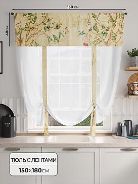 ВыбратьТюль 1 шт. Легкий, мягкий тюль из вуали дополнен отделкой в виде декоративных завязок и ламбрекеном, оформленным фотопечатью. Тюль имитирует римскую штору. Подъем и опускание осуществляется за счет декоративных лент. Вуаль с матовой полупрозрачной текстурой. Отличается особым шиком, идеально подходит для создания воздушных штор. Придает ощущение свежести, хорошо пропускает воздух. Ткань неприхотлива в уходе, хорошо стирается без разрушения волокон с течением времени за счет высокого кручения нитей.