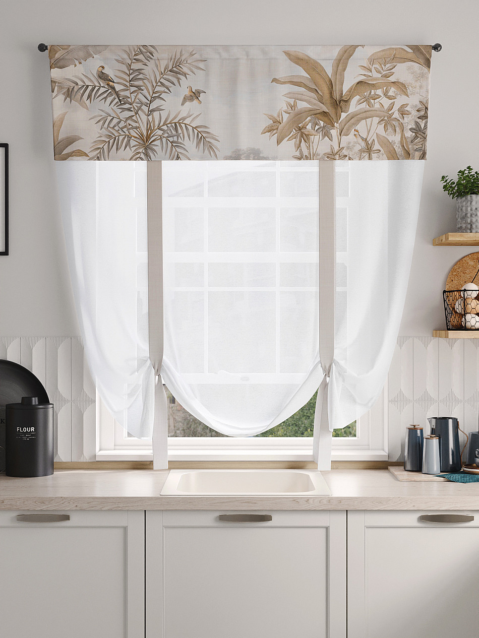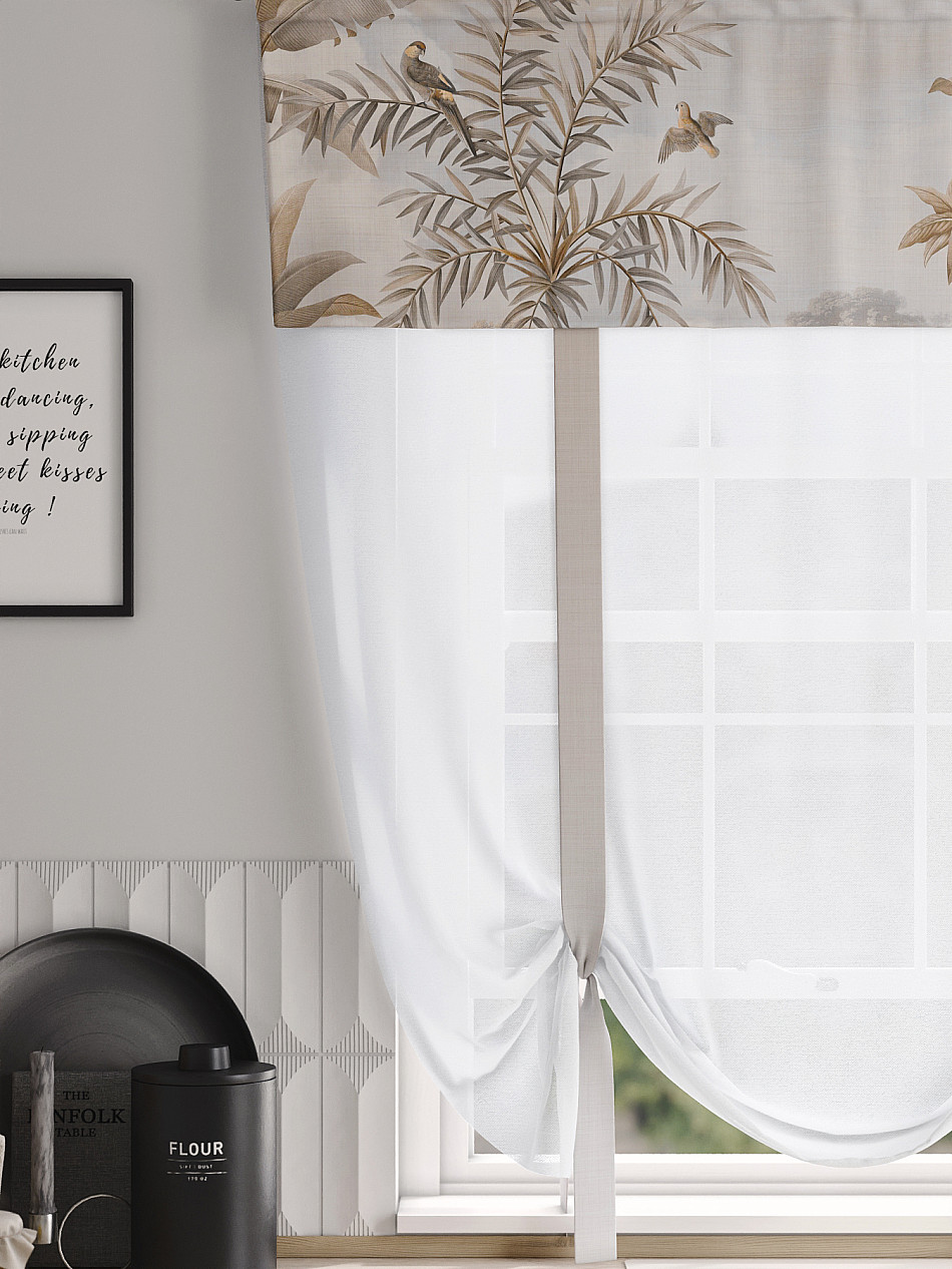 ВыбратьТюль 1 шт. Легкий, мягкий тюль из вуали дополнен отделкой в виде декоративных завязок и ламбрекеном, оформленным фотопечатью. Тюль имитирует римскую штору. Подъем и опускание осуществляется за счет декоративных лент. Вуаль с матовой полупрозрачной текстурой. Отличается особым шиком, идеально подходит для создания воздушных штор. Придает ощущение свежести, хорошо пропускает воздух. Ткань неприхотлива в уходе, хорошо стирается без разрушения волокон с течением времени за счет высокого кручения нитей.