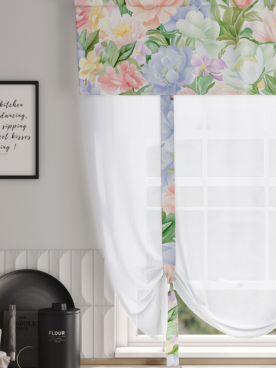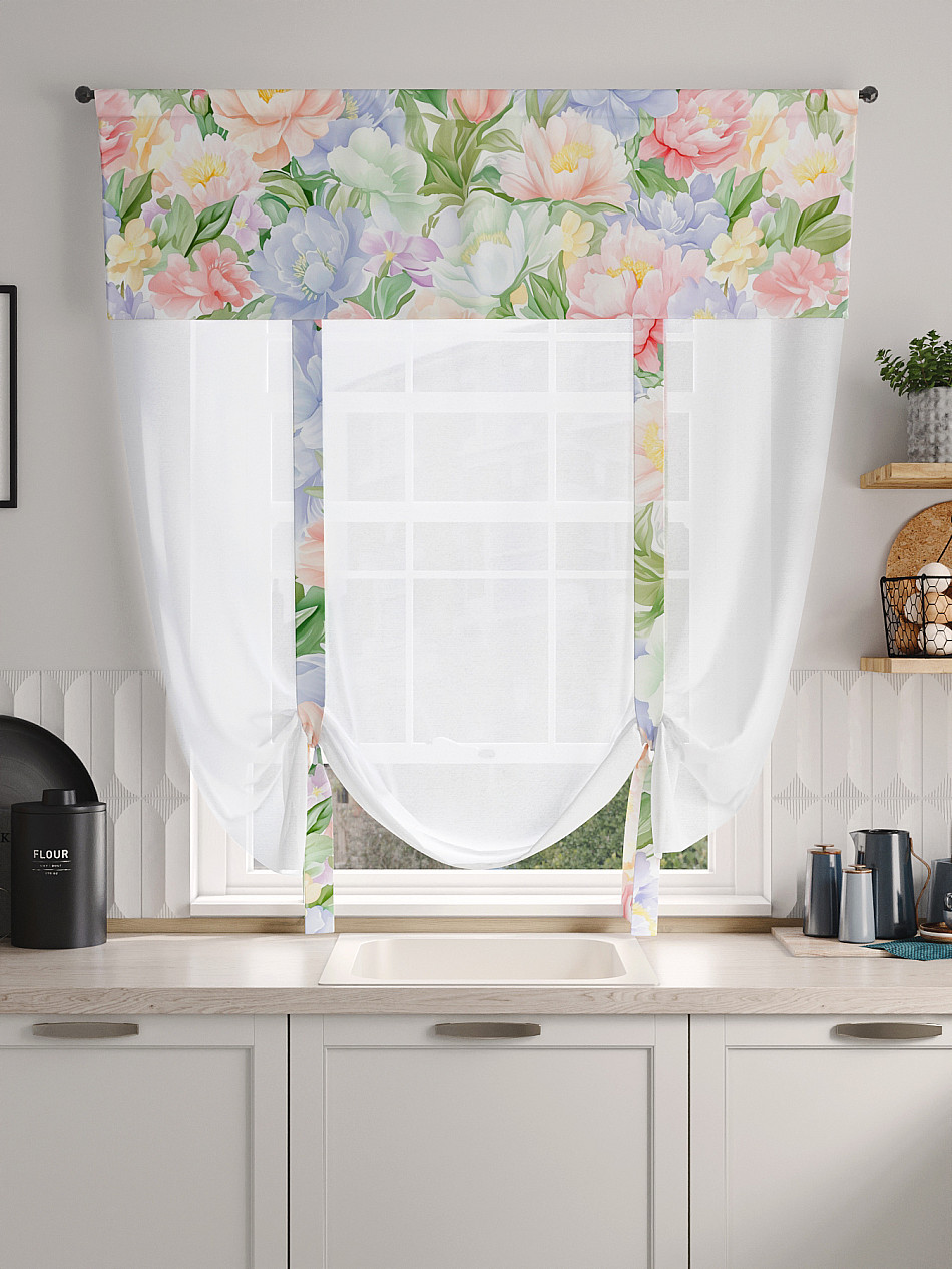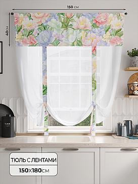 ВыбратьТюль 1 шт. Легкий, мягкий тюль из вуали дополнен отделкой в виде декоративных завязок и ламбрекеном, оформленным фотопечатью. Тюль имитирует римскую штору. Подъем и опускание осуществляется за счет декоративных лент. Вуаль с матовой полупрозрачной текстурой. Отличается особым шиком, идеально подходит для создания воздушных штор. Придает ощущение свежести, хорошо пропускает воздух. Ткань неприхотлива в уходе, хорошо стирается без разрушения волокон с течением времени за счет высокого кручения нитей.