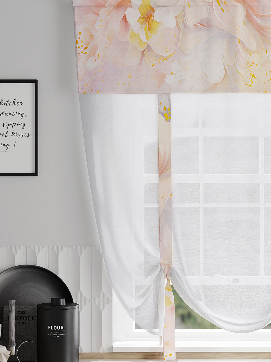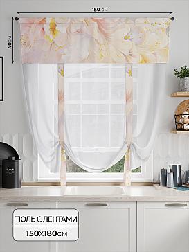 ВыбратьТюль 1 шт. Легкий, мягкий тюль из вуали дополнен отделкой в виде декоративных завязок и ламбрекеном, оформленным фотопечатью. Тюль имитирует римскую штору. Подъем и опускание осуществляется за счет декоративных лент. Вуаль с матовой полупрозрачной текстурой. Отличается особым шиком, идеально подходит для создания воздушных штор. Придает ощущение свежести, хорошо пропускает воздух. Ткань неприхотлива в уходе, хорошо стирается без разрушения волокон с течением времени за счет высокого кручения нитей.
