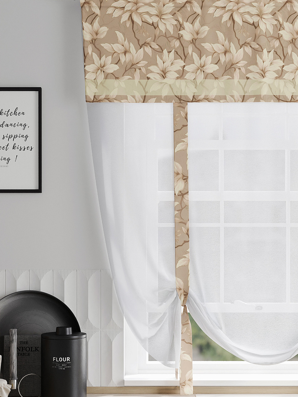 ВыбратьТюль 1 шт. Легкий, мягкий тюль из вуали дополнен отделкой в виде декоративных завязок и ламбрекеном, оформленным фотопечатью. Тюль имитирует римскую штору. Подъем и опускание осуществляется за счет декоративных лент. Вуаль с матовой полупрозрачной текстурой. Отличается особым шиком, идеально подходит для создания воздушных штор. Придает ощущение свежести, хорошо пропускает воздух. Ткань неприхотлива в уходе, хорошо стирается без разрушения волокон с течением времени за счет высокого кручения нитей.