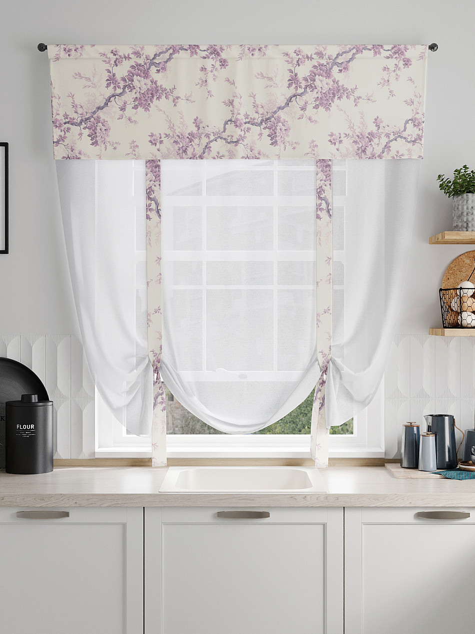 ВыбратьТюль 1 шт. Легкий, мягкий тюль из вуали дополнен отделкой в виде декоративных завязок и ламбрекеном, оформленным фотопечатью. Тюль имитирует римскую штору. Подъем и опускание осуществляется за счет декоративных лент. Вуаль с матовой полупрозрачной текстурой. Отличается особым шиком, идеально подходит для создания воздушных штор. Придает ощущение свежести, хорошо пропускает воздух. Ткань неприхотлива в уходе, хорошо стирается без разрушения волокон с течением времени за счет высокого кручения нитей.