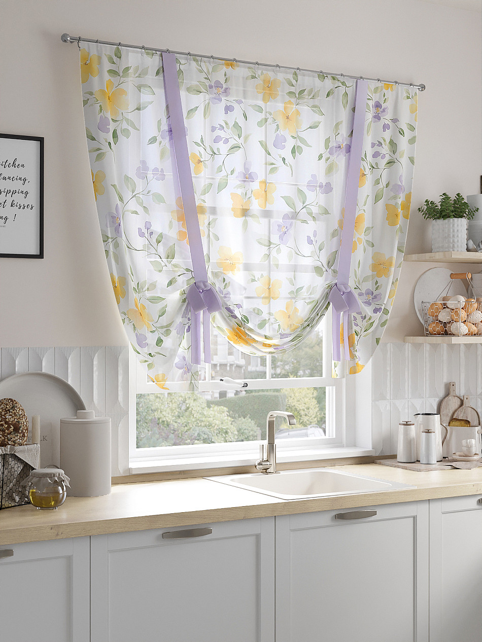 ВыбратьТюль 1 шт. Легкий, мягкий тюль из вуали оформлен фотопечатью, дополнен отделкой в виде декоративных завязок. Тюль имитирует римскую штору. Подъем и опускание осуществляется за счет декоративных лент. Вуаль с матовой полупрозрачной текстурой. Отличается особым шиком, идеально подходит для создания воздушных штор. Придает ощущение свежести, хорошо пропускает воздух. Ткань неприхотлива в уходе, хорошо стирается без разрушения волокон с течением времени за счет высокого кручения нитей.
