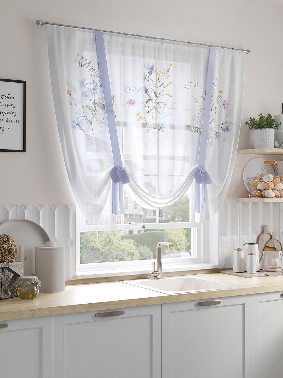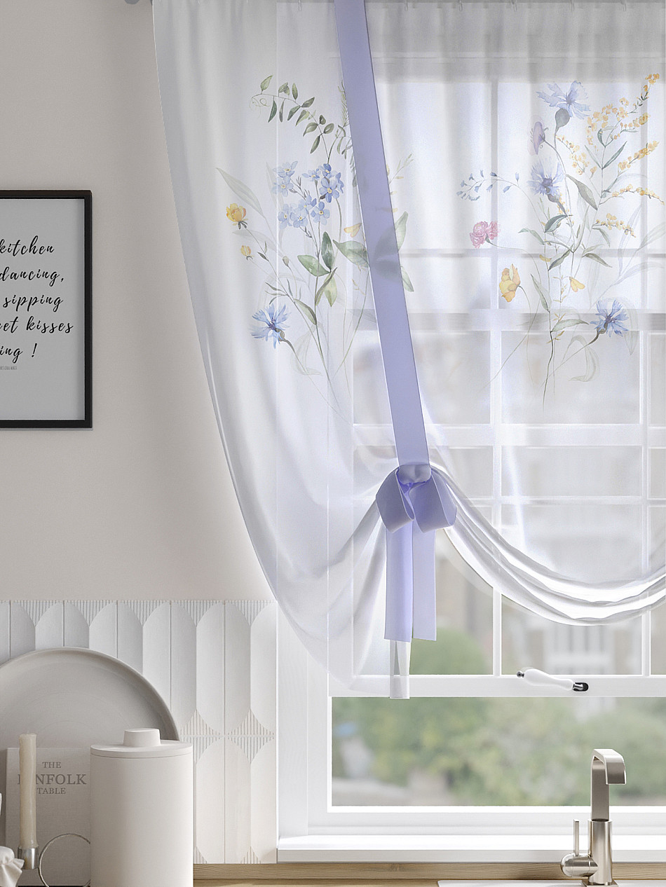 ВыбратьТюль 1 шт. Легкий, мягкий тюль из вуали оформлен фотопечатью, дополнен отделкой в виде декоративных завязок. Тюль имитирует римскую штору. Подъем и опускание осуществляется за счет декоративных лент. Вуаль с матовой полупрозрачной текстурой. Отличается особым шиком, идеально подходит для создания воздушных штор. Придает ощущение свежести, хорошо пропускает воздух. Ткань неприхотлива в уходе, хорошо стирается без разрушения волокон с течением времени за счет высокого кручения нитей.