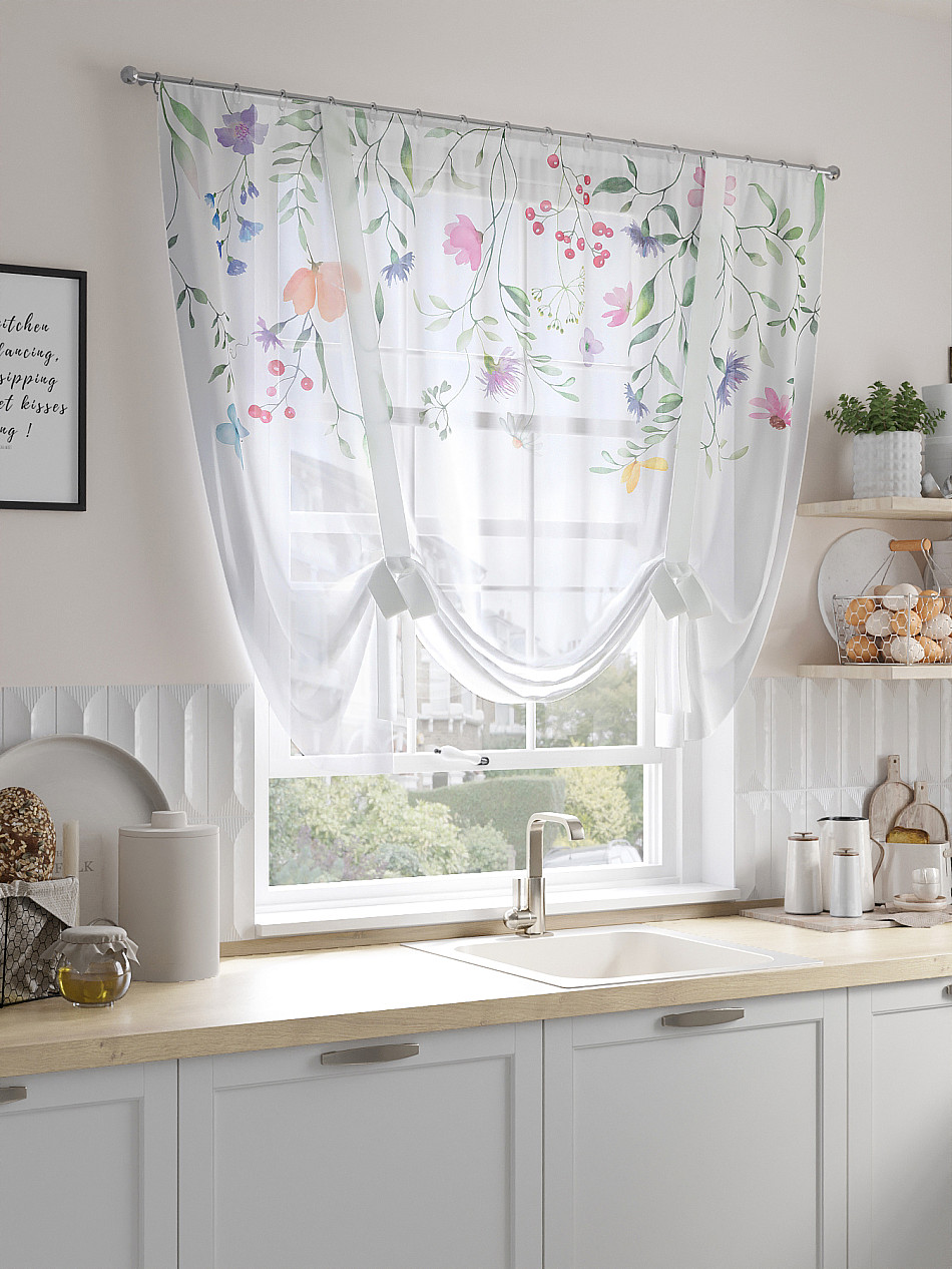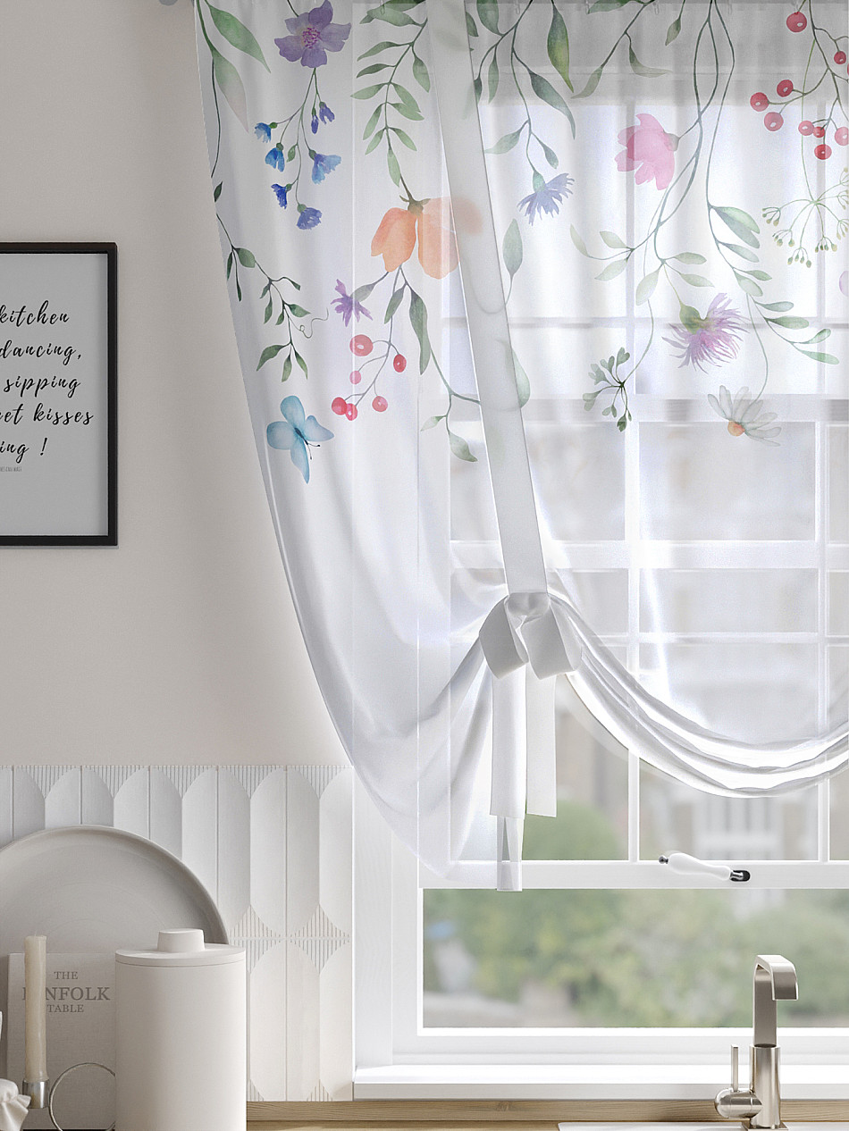 ВыбратьТюль 1 шт. Легкий, мягкий тюль из вуали оформлен фотопечатью, дополнен отделкой в виде декоративных завязок. Тюль имитирует римскую штору. Подъем и опускание осуществляется за счет декоративных лент. Вуаль с матовой полупрозрачной текстурой. Отличается особым шиком, идеально подходит для создания воздушных штор. Придает ощущение свежести, хорошо пропускает воздух. Ткань неприхотлива в уходе, хорошо стирается без разрушения волокон с течением времени за счет высокого кручения нитей.
