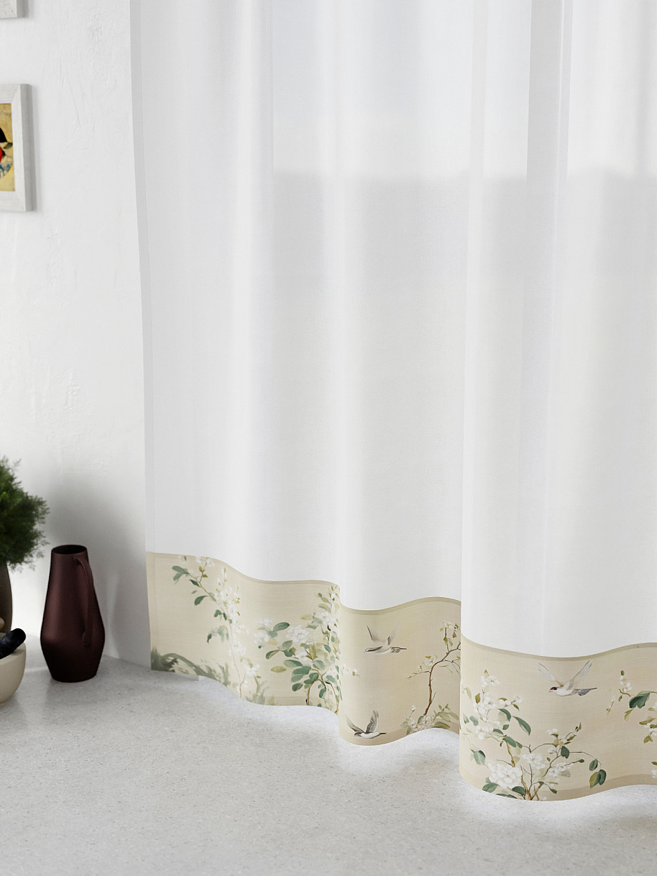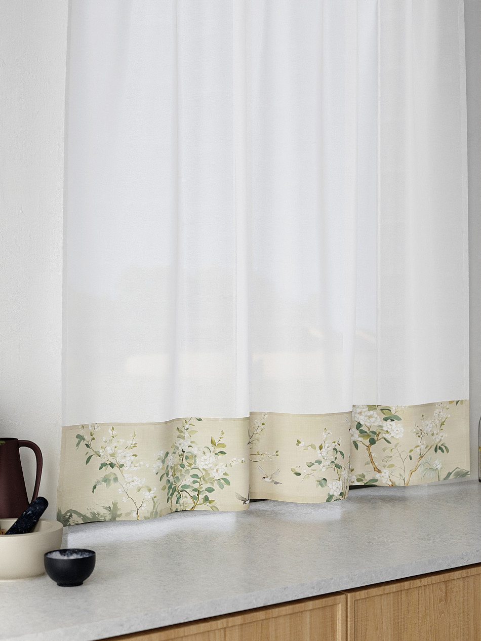 Легкая основа (вуаль) дополнена по нижнему краю портьерной тканью (габардин) с печатным рисунком. Вуаль с матовой полупрозрачной текстурой. Отличается особым шиком, идеально подходит для создания воздушных штор. Придает ощущение свежести, хорошо пропускает воздух. Ткань неприхотлива в уходе, хорошо стирается без разрушения волокон с течением времени за счет высокого кручения нитей.