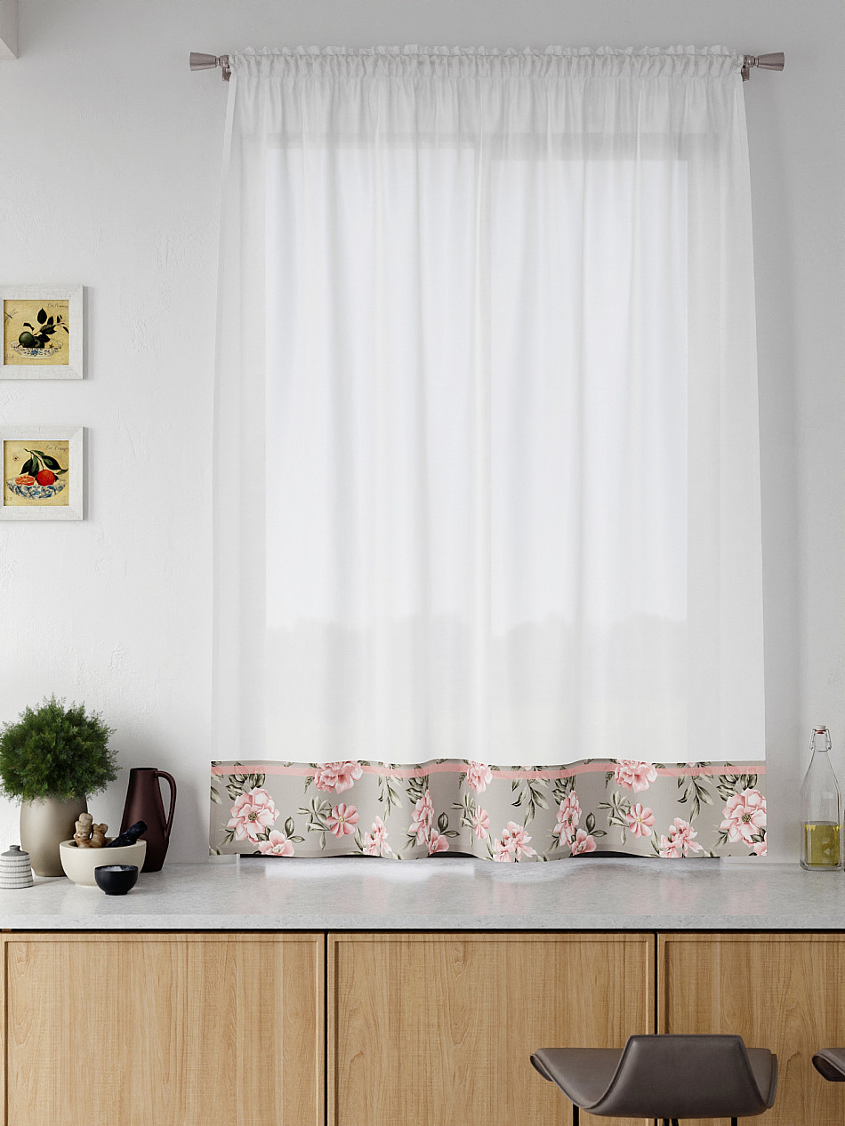 Легкая основа (вуаль) дополнена по нижнему краю портьерной тканью (габардин) с печатным рисунком. Вуаль с матовой полупрозрачной текстурой. Отличается особым шиком, идеально подходит для создания воздушных штор. Придает ощущение свежести, хорошо пропускает воздух. Ткань неприхотлива в уходе, хорошо стирается без разрушения волокон с течением времени за счет высокого кручения нитей.
