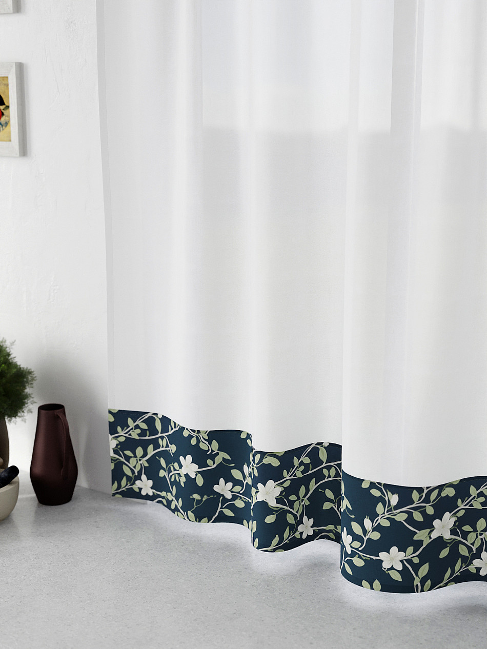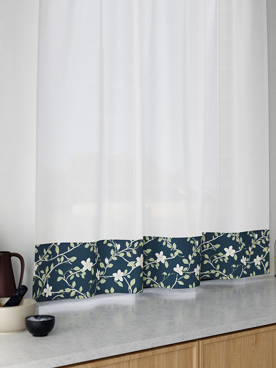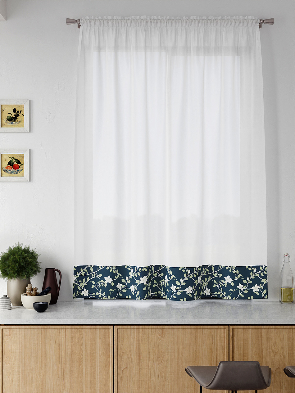 Легкая основа (вуаль) дополнена по нижнему краю портьерной тканью (габардин) с печатным рисунком. Вуаль с матовой полупрозрачной текстурой. Отличается особым шиком, идеально подходит для создания воздушных штор. Придает ощущение свежести, хорошо пропускает воздух. Ткань неприхотлива в уходе, хорошо стирается без разрушения волокон с течением времени за счет высокого кручения нитей.