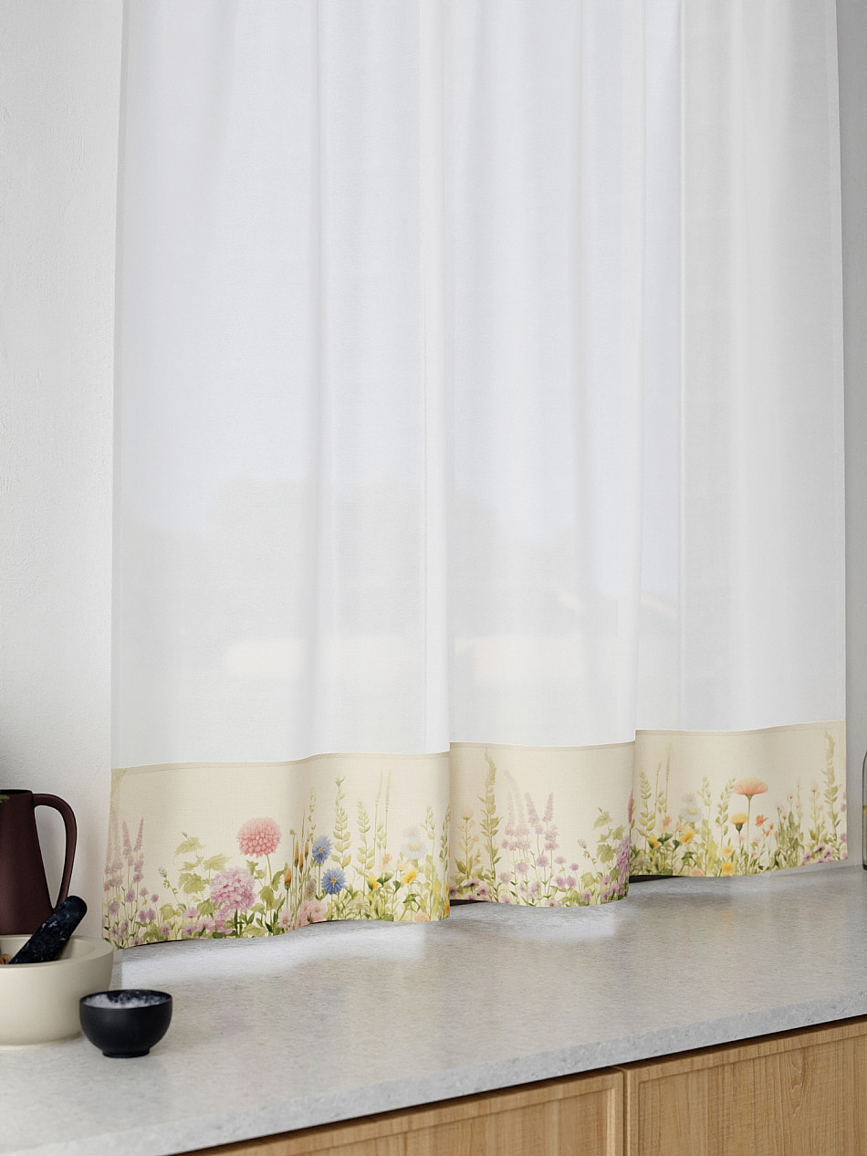 Легкая основа (вуаль) дополнена по нижнему краю портьерной тканью (габардин) с печатным рисунком. Вуаль с матовой полупрозрачной текстурой. Отличается особым шиком, идеально подходит для создания воздушных штор. Придает ощущение свежести, хорошо пропускает воздух. Ткань неприхотлива в уходе, хорошо стирается без разрушения волокон с течением времени за счет высокого кручения нитей.