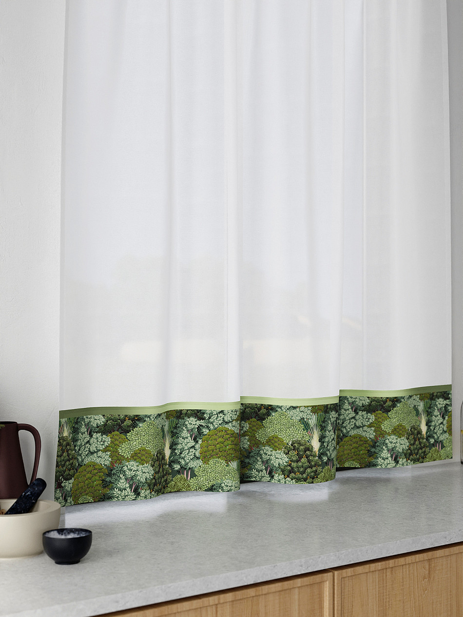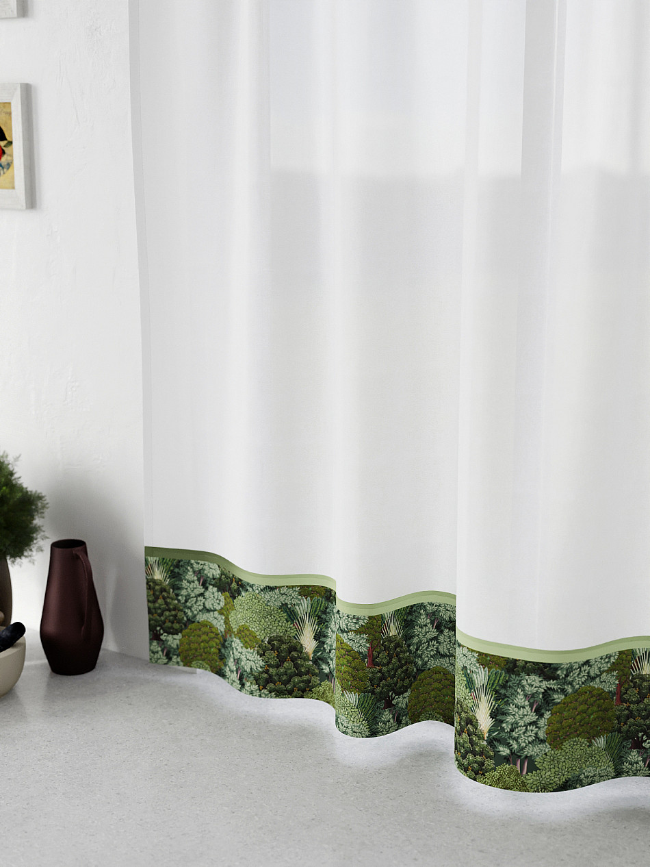 Легкая основа (вуаль) дополнена по нижнему краю портьерной тканью (габардин) с печатным рисунком. Вуаль с матовой полупрозрачной текстурой. Отличается особым шиком, идеально подходит для создания воздушных штор. Придает ощущение свежести, хорошо пропускает воздух. Ткань неприхотлива в уходе, хорошо стирается без разрушения волокон с течением времени за счет высокого кручения нитей.