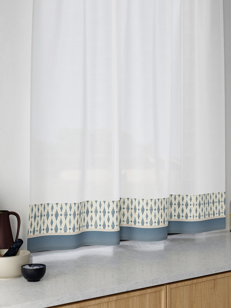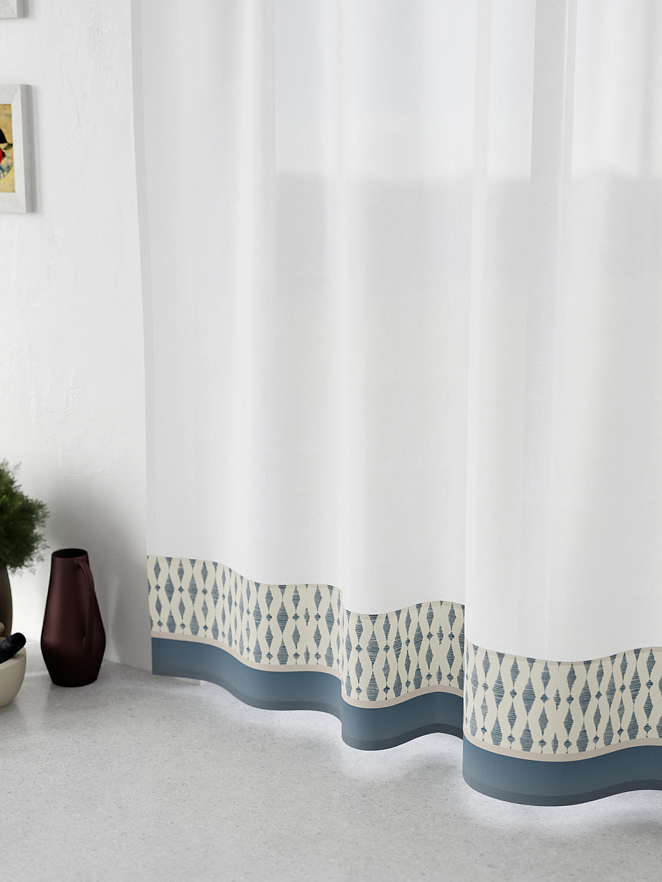 Легкая основа (вуаль) дополнена по нижнему краю портьерной тканью (габардин) с печатным рисунком. Вуаль с матовой полупрозрачной текстурой. Отличается особым шиком, идеально подходит для создания воздушных штор. Придает ощущение свежести, хорошо пропускает воздух. Ткань неприхотлива в уходе, хорошо стирается без разрушения волокон с течением времени за счет высокого кручения нитей.