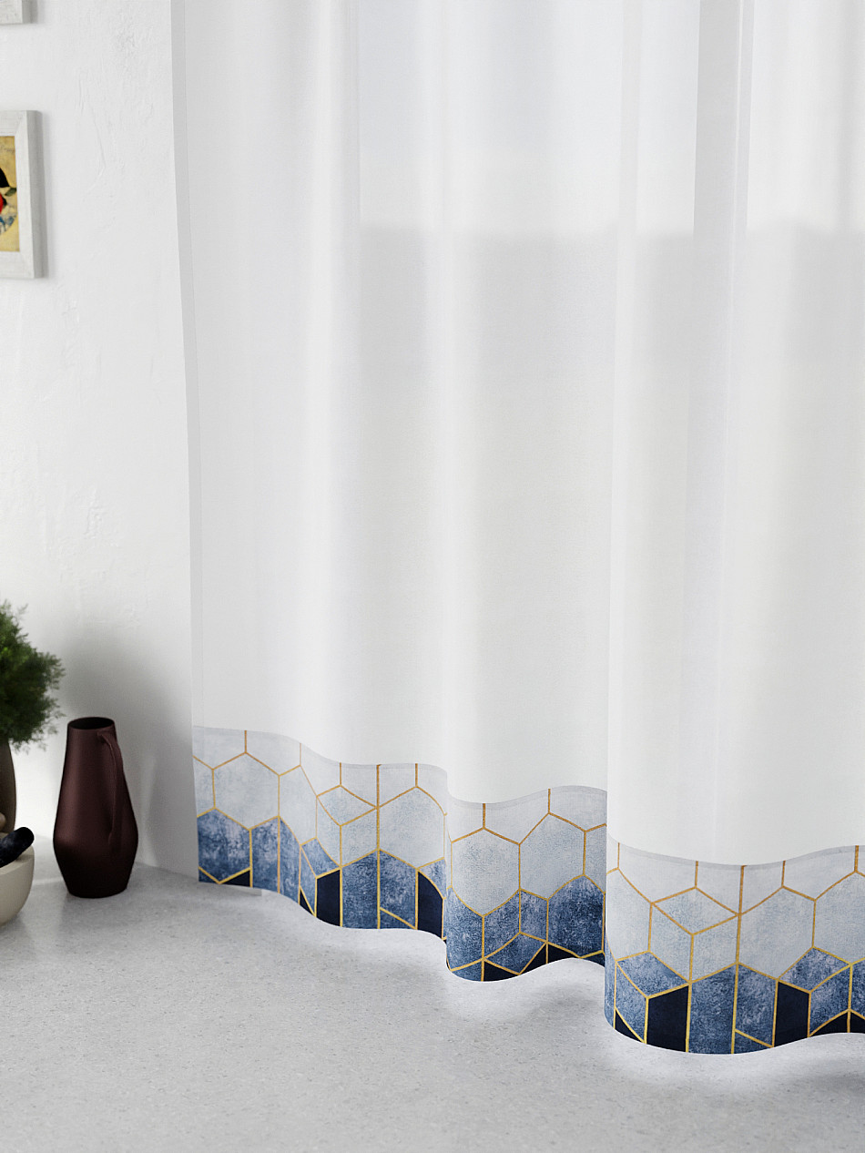 Легкая основа (вуаль) дополнена по нижнему краю портьерной тканью (габардин) с печатным рисунком. Вуаль с матовой полупрозрачной текстурой. Отличается особым шиком, идеально подходит для создания воздушных штор. Придает ощущение свежести, хорошо пропускает воздух. Ткань неприхотлива в уходе, хорошо стирается без разрушения волокон с течением времени за счет высокого кручения нитей.