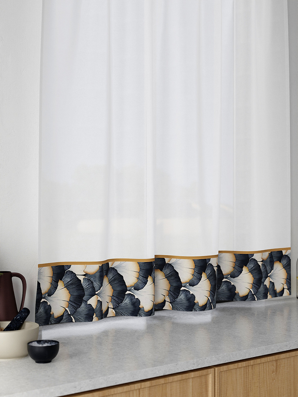 Легкая основа (вуаль) дополнена по нижнему краю портьерной тканью (габардин) с печатным рисунком. Вуаль с матовой полупрозрачной текстурой. Отличается особым шиком, идеально подходит для создания воздушных штор. Придает ощущение свежести, хорошо пропускает воздух. Ткань неприхотлива в уходе, хорошо стирается без разрушения волокон с течением времени за счет высокого кручения нитей.