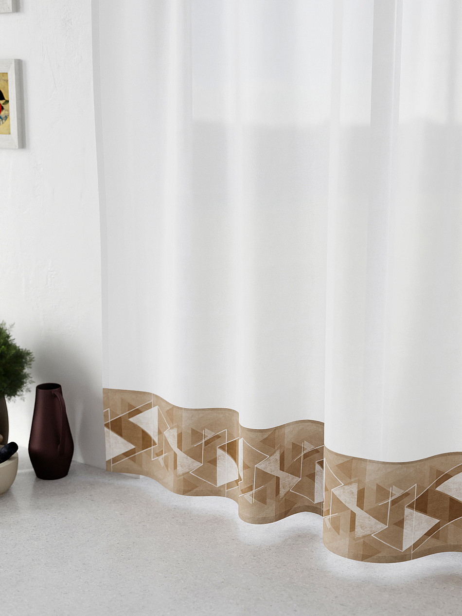 Легкая основа (вуаль) дополнена по нижнему краю портьерной тканью (габардин) с печатным рисунком. Вуаль с матовой полупрозрачной текстурой. Отличается особым шиком, идеально подходит для создания воздушных штор. Придает ощущение свежести, хорошо пропускает воздух. Ткань неприхотлива в уходе, хорошо стирается без разрушения волокон с течением времени за счет высокого кручения нитей.