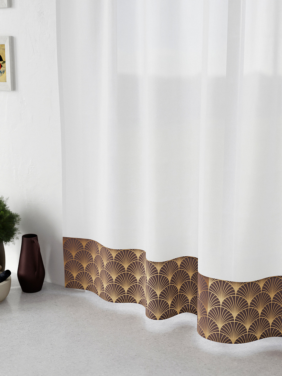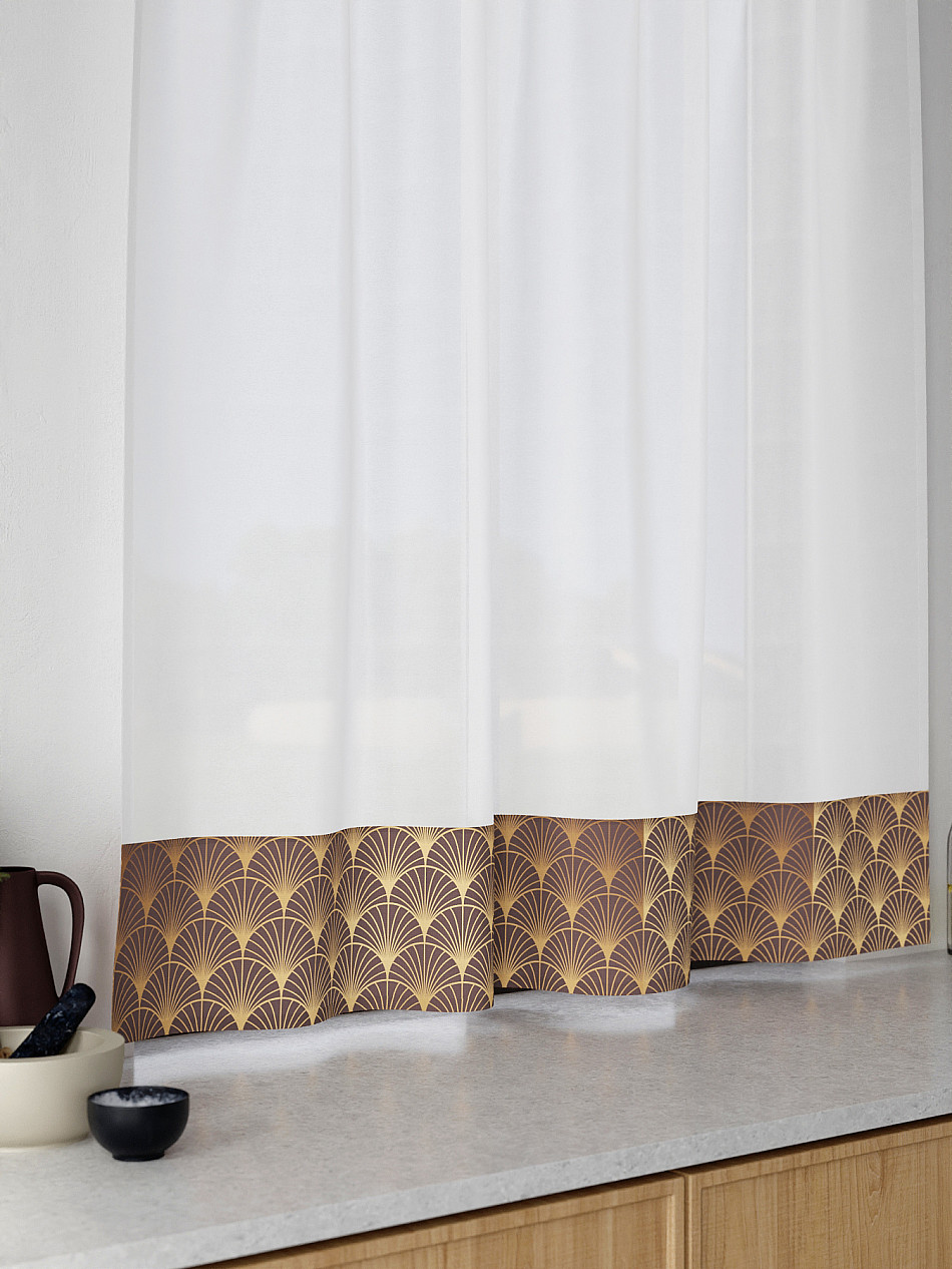 Легкая основа (вуаль) дополнена по нижнему краю портьерной тканью (габардин) с печатным рисунком. Вуаль с матовой полупрозрачной текстурой. Отличается особым шиком, идеально подходит для создания воздушных штор. Придает ощущение свежести, хорошо пропускает воздух. Ткань неприхотлива в уходе, хорошо стирается без разрушения волокон с течением времени за счет высокого кручения нитей.