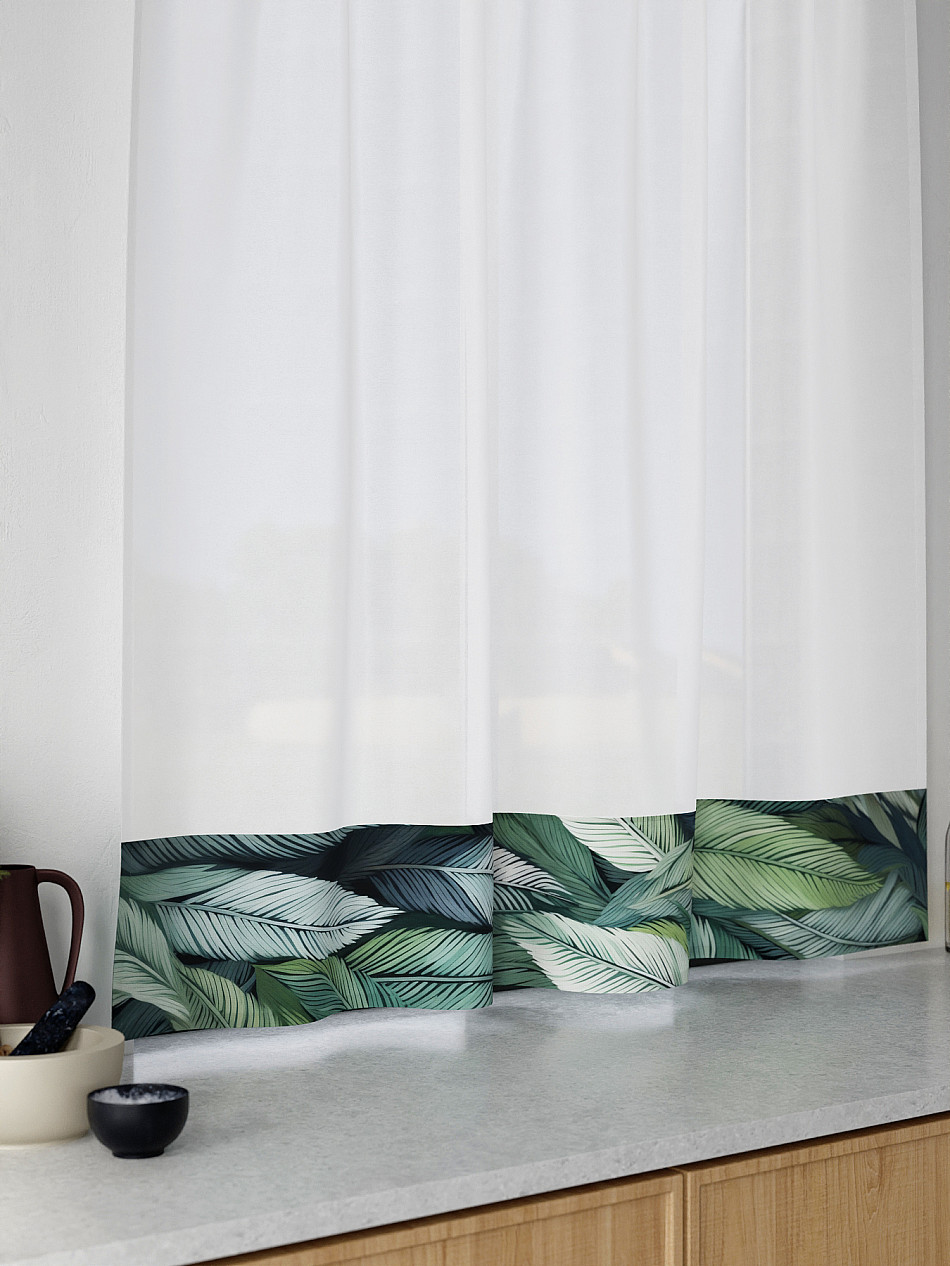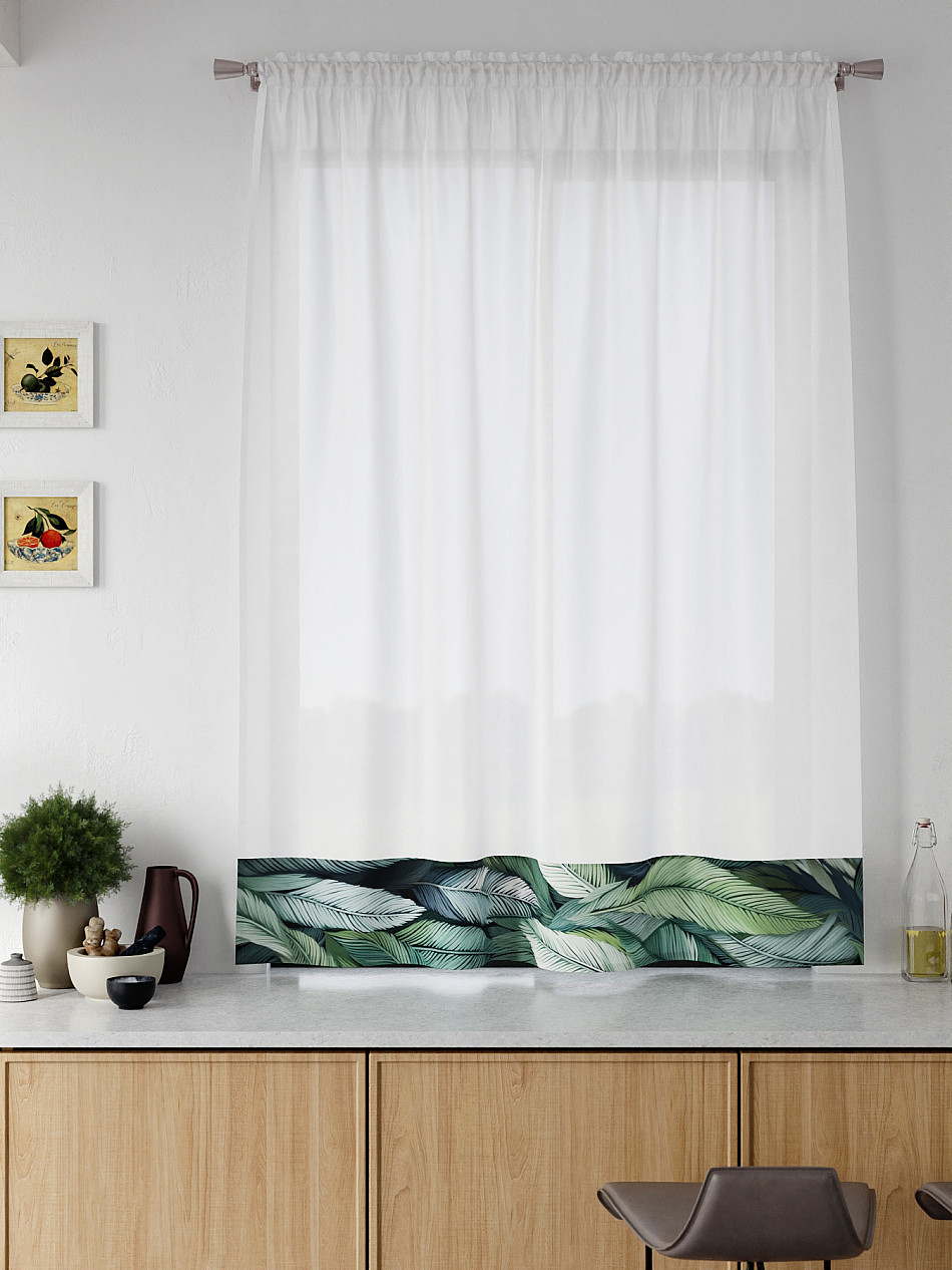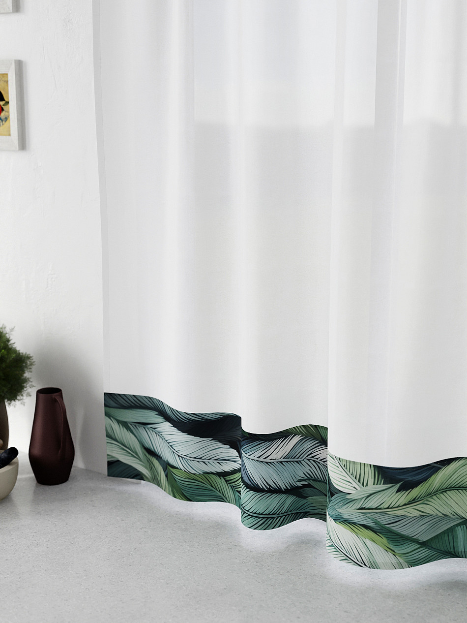 Легкая основа (вуаль) дополнена по нижнему краю портьерной тканью (габардин) с печатным рисунком. Вуаль с матовой полупрозрачной текстурой. Отличается особым шиком, идеально подходит для создания воздушных штор. Придает ощущение свежести, хорошо пропускает воздух. Ткань неприхотлива в уходе, хорошо стирается без разрушения волокон с течением времени за счет высокого кручения нитей.